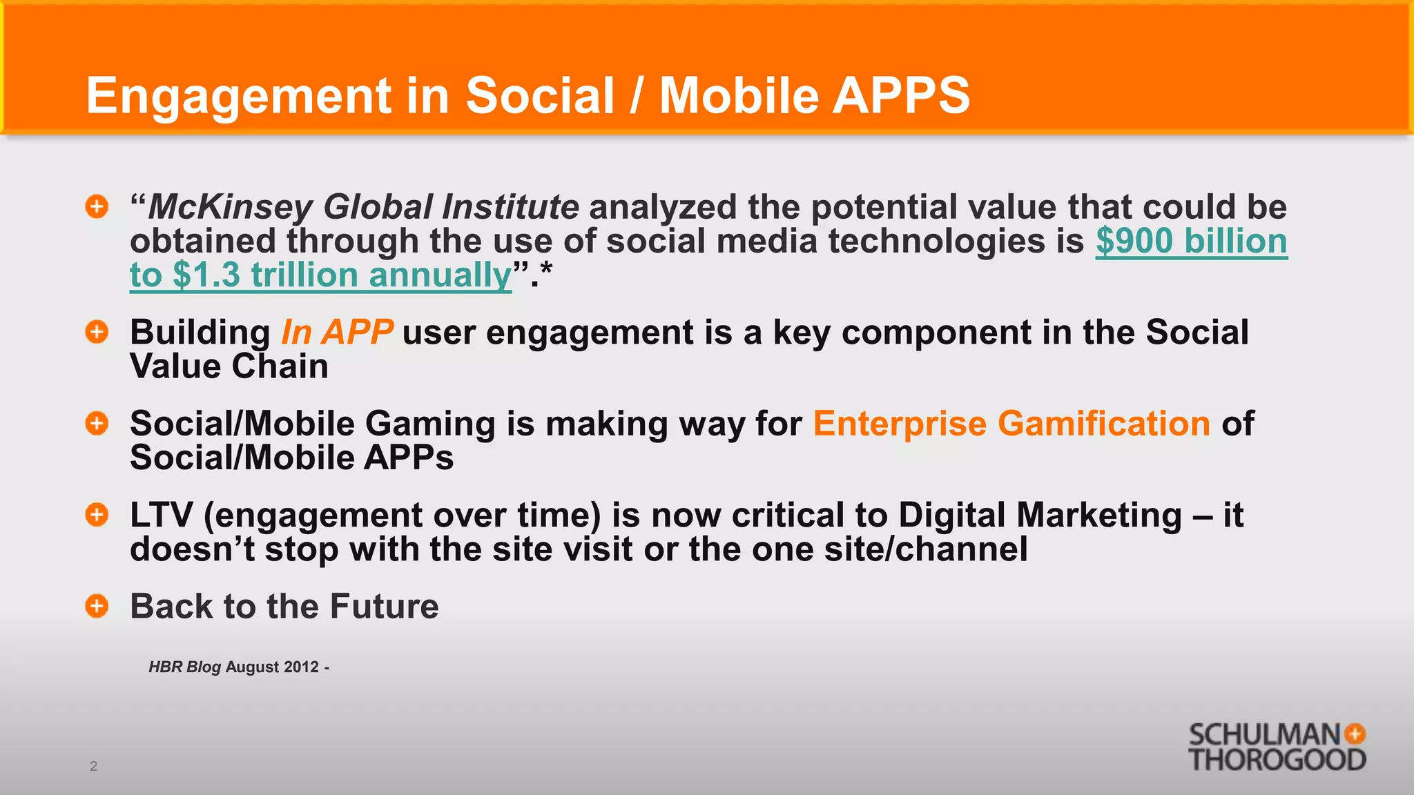 Rand Schulman presents on the importance of engagement in social and mobile apps. Building user engagement is key to increasing lifetime value and driving viral adoption. Gamification techniques can increase engagement by 30-40% in areas like content, media, and healthcare. Effective analytics and A/B testing are critical to optimizing apps for engagement and revenue. Companies should collect behavioral data, measure results, and iterate engagement strategies.