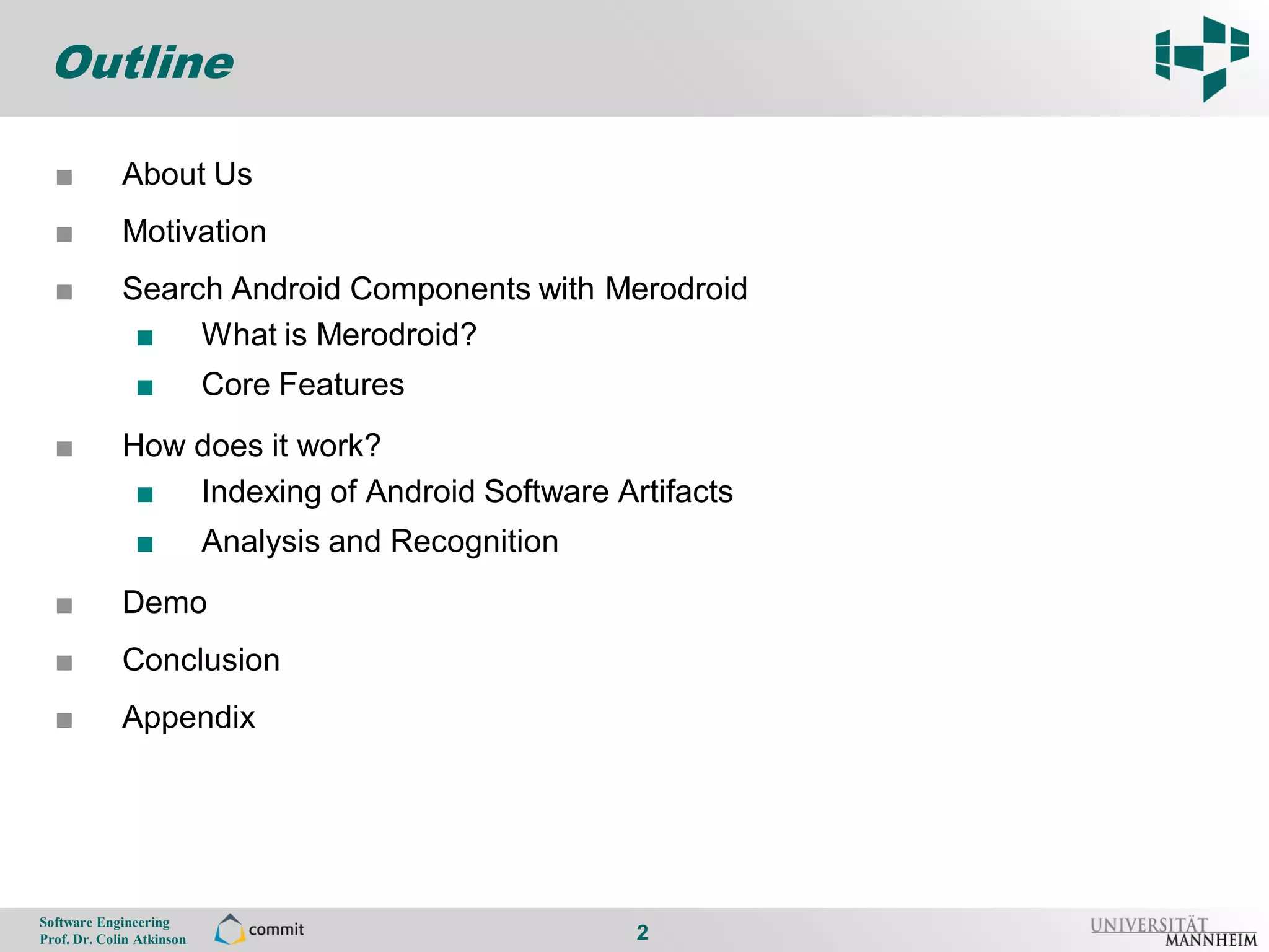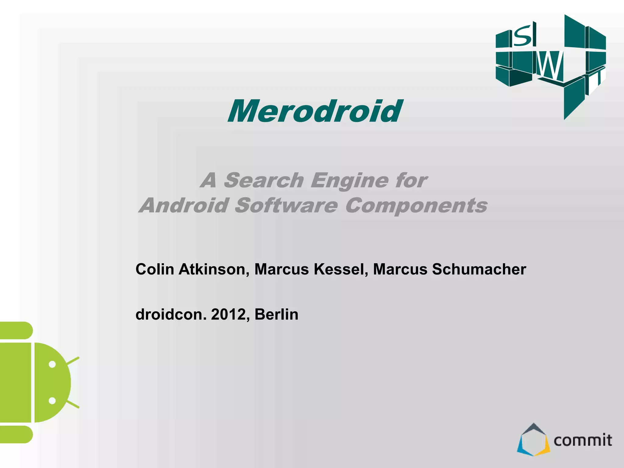The document presents Merodroid, a search engine tailored for Android application developers to efficiently find and reuse software components, reducing redundant efforts in mobile app development. It outlines the motivations for this technology, its core features, indexing processes, and potential future developments, such as an Eclipse plugin and test-driven development support. The goal is to enhance the component-driven development approach in the rapidly growing mobile market.
