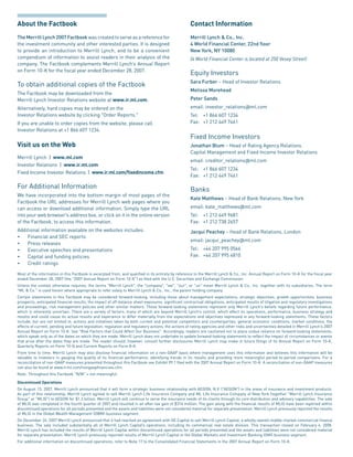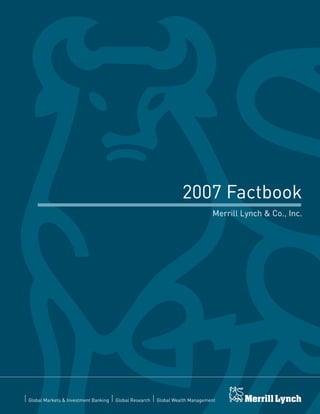 This document is the 2007 Factbook for Merrill Lynch & Co., Inc. It provides an introduction to the company and compiles key information for investors and other interested parties. The Factbook summarizes Merrill Lynch's business segments, financial performance, leadership, and other details to assist readers in their analysis of the company. It directs readers to the company's annual report and investor relations website for additional information.