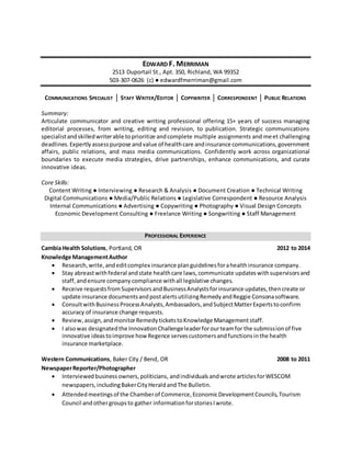 Edward Merriman has over 15 years of experience in communications, writing, and editing. He has worked as a knowledge management author for a health insurance company, a newspaper reporter and photographer, and in public relations and media consulting. Merriman has expertise in content writing, research, technical writing, public relations, and copywriting. He is skilled at prioritizing assignments and meeting deadlines.
