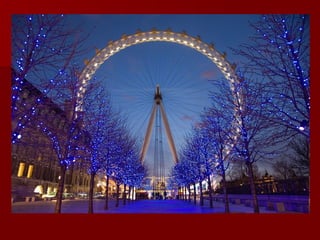 This document discusses Christmas traditions in England, including celebrating Christmas Eve on December 24th and Christmas Day on the 25th. It mentions Father Christmas and Rudolf the red nosed reindeer, as well as Christmas traditions like Advent calendars, decorating with holly, tinsel, Christmas trees and balls, and eating Christmas dinner featuring pudding, cake and mince pies. The document concludes by wishing a Merry Christmas and Happy New Year.