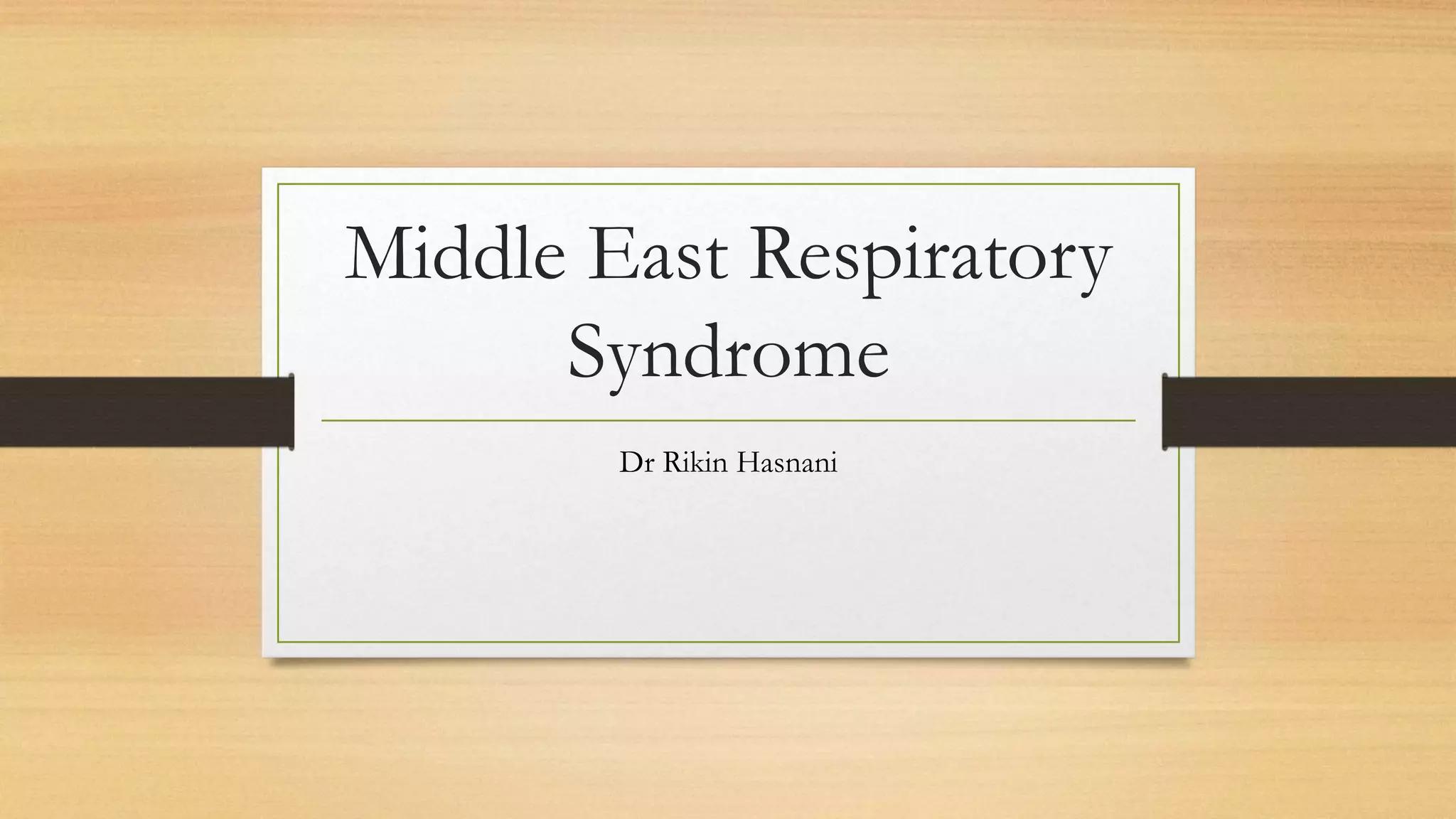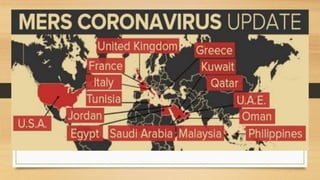 Middle East respiratory syndrome (MERS) is a respiratory disease caused by the MERS coronavirus (MERS-CoV) which was first reported in 2012 in Saudi Arabia. As of now, there have been 688 reported cases of MERS of which 282 resulted in death, a 40% mortality rate. Camels have been identified as a potential reservoir for the virus. The virus is transmitted from human to human through direct contact or contaminated surfaces and causes respiratory symptoms. There is currently no vaccine though several treatments are being investigated.