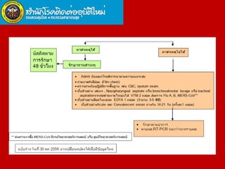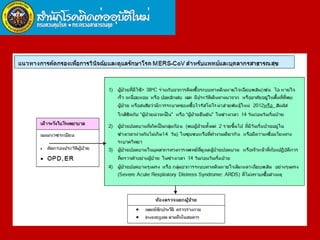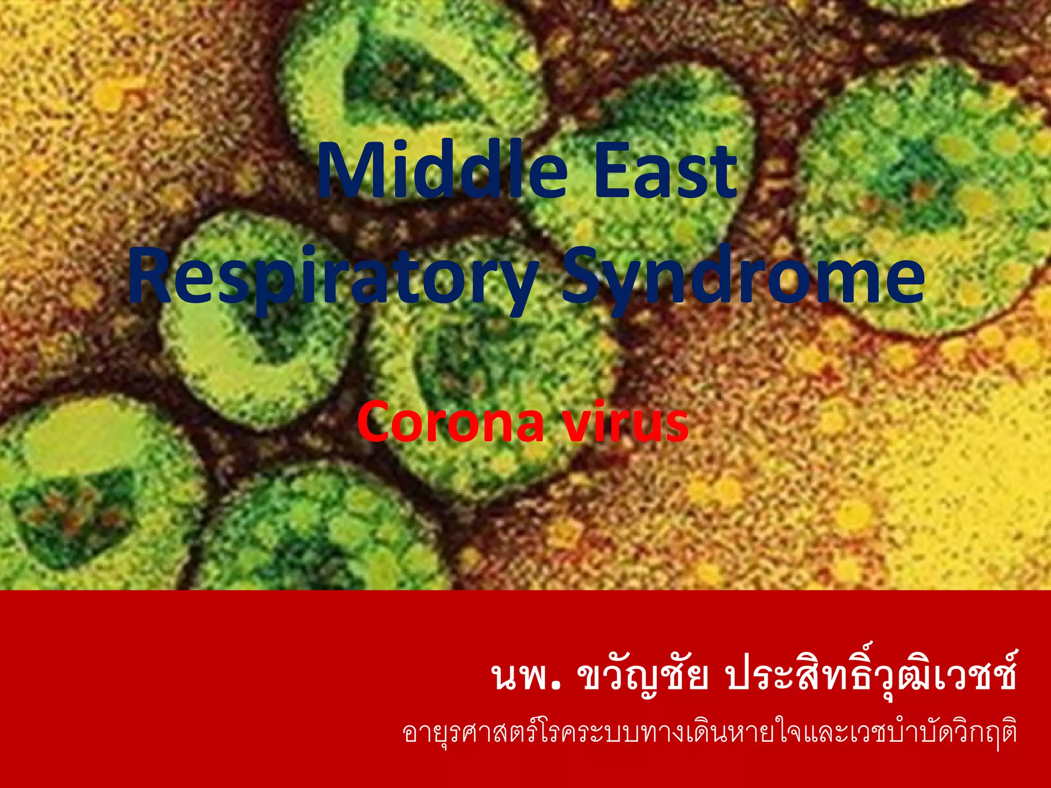 Middle East Respiratory Syndrome Coronavirus (MERS-CoV) was first identified in Saudi Arabia in June 2012 and is associated with severe respiratory illness, often linked to underlying medical conditions. The disease has a median incubation period of 5-14 days, with symptoms ranging from asymptomatic to severe pneumonia and gastrointestinal issues. Transmission occurs primarily through close contact and healthcare settings, and while no specific treatment exists, management focuses on organ support and infection control.