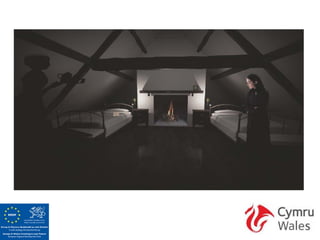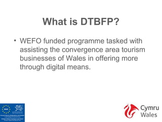 The document summarizes the Digital Tourism Business Framework Project (DTBFP) in Wales, which provides funding and resources to help tourism businesses adopt new digital technologies. The goals of the DTBFP are to equip tourism businesses with ICT skills, encourage collaboration through digital means, provide visitors with more online information, and increase awareness of digital opportunities. The DTBFP offers diagnostics, training workshops, help developing digital communities and apps, and a website for sharing content. Examples provided include using augmented reality, QR trails, online booking engines, and social media to engage visitors.