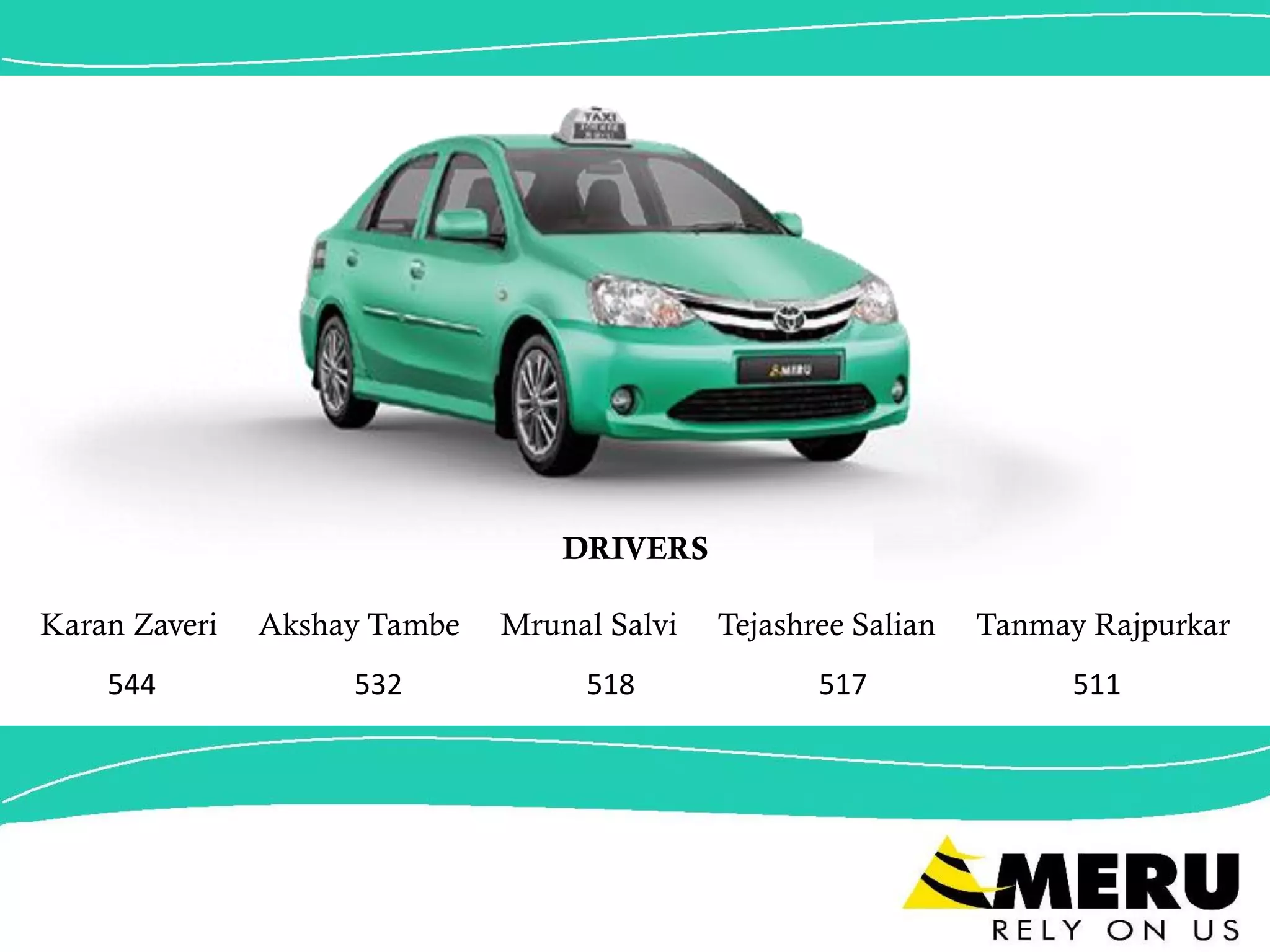 Meru Cabs is one of the largest radio taxi operators in India with a fleet of over 10,000 cabs across major cities. It was one of the first companies to launch metered radio taxis in India in 2007. Meru Cabs provides 24/7 taxi services that can be booked through calls, websites or apps. It uses GPS technology for location tracking and dispatch. While Meru Cabs has a strong brand recognition, it faces stiff competition from startups like Ola and Uber that have expanded more widely across India and offer cashless payment options. To strengthen its position, Meru Cabs could partner with financial institutions for funding to replace older vehicles and improve driver training to reduce cancellations. It could