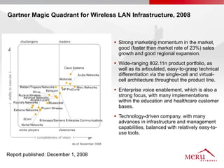 Meru's wireless LAN solutions emphasize a unique architecture enabling seamless connectivity, scalability, and efficient voice applications, showing strong growth and regional expansion in the market. The technology supports advanced features such as application-aware optimization, enhanced security, and innovative wireless management that simplify deployment and reduce operational costs. Notable deployments highlight the performance improvements and high user density capabilities offered by the Meru system.