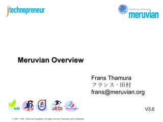 Meruvian is an education and development institute based in Java and open source technologies. It was founded in 2006 to link the education and industry sectors. The document outlines Meruvian's founder Frans Thamura, vision and mission to bridge the gap between education and industry. It also describes Meruvian's methodology, products, programs and services like job skills assessment and an integrated technopreneurship center.