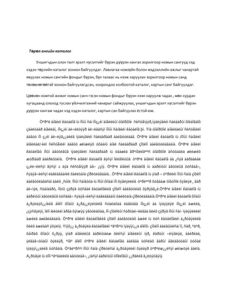 интернэт <br />Дүгнэлт<br />Каталог, картын сангийн систем нь шинжлэх ухааны зарчмаар хүртээмжтэй, төвлөгөөтэй байх үндсэн дээр зохион байгуулагддаг. <br />Тус системийг зөв зохистой байрлуулж, үзүүлэн таниулах мэдээллийн хэрэгслээр хангасан байх ёстой байдаг. Аль ч номын сангийн каталог, картын сангийн системд уншигчдын үсэг дарааллын каталог, уншигчдын төрөл ангийн каталог, албаны үсэг дарааллын каталог, сонин, сэтгүүлийн өгүүллийн сэдэвчилсэн, төрөл ангийн картын сан мөн тогтмол хэвлэлийн картын сан орно.<br /> Íîì õýâëýëèéí àãóóëãûí òàéëáàð áóþó òóõàéí íîìûí çîðèóëàëò, çîõèîã÷èéí òóõàé òîäîðõîéëîëò, îí õóóäàñ, ¿íý, õýâëýõ ¿éëäâýð çýðãèéã äýñ äàðààëàëòàé ó÷èð ç¿éí õîëáîîòîé ìýäýýëýõ ÿâäàë íü áè÷èã ñî¸ëòîé àðä ò¿ìíèé ºíº ýðòíèé óëàìæëàëò ò¿¿õòýé áºãººä ìàíàé ýðò ¿åèéí ýðäýìòýí ìýðãýä ìààíü ÷ áàñ ýðõýìëýí ÷óõàë÷èëæ õºãæ¿¿ëñýýð èðñýí ò¿¿õòýé áèëýý. <br />Íîìûí ñàíãèéí àãóóëãûã óíøèã÷äàä íýýí õàðóóëàõ, òàíèóëàõ, ôîíäûí ýðãýëò àøèãëàëòûã ñàéæðóóëõàä êàòàëîã íü ÷óõàë ¿¿ðýã ã¿éöýòãýäýã àæýý. Ëàâëàãàà íîì ç¿éí áîëîí ìýäýýëëèéí àæëûã ÷àíàðòàé ÿâóóëàõ íîìûí ñàíãèéí ôîíäûã á¿ðýí á¿õ òàëààñ íü íýýæ õàðóóëàõ çîðèëãîîð íîìûí ñàíä òºëºâëºãººòýé çîõèîí áàéãóóëàãäñàí õîîðîíäîî õîëáîîòîé êàòàëîã áàéãóóëäàã. Öººõºí íîìòîé æèæèã íîìûí ñàí ÷ ãýñýí ººðèéí ãýñýí êàòàëîã êàðòûí ñàíòàé áàéõ ¸ñòîé àæýý. <br />Төрөл ангийн каталогийг номын санд байснаар номын фондонд байгаа ном болон хэвлэмэл материалуудыг мэдлэгийн салбараар нь харуулдаг юм. <br />Дэлхий даяар хүмүүнлэгийн салбарт, ялангуяа соёл боловсрол, мэдлэг, мэдээллийн салбарт даяарчлал гүнзгийрч байгаа өнөө үед улс орнуудын номын сан, мэдээллийн хөгжил хэдийгээр харилцан адилгүй жигд бус байгаа боловч хөгжлийн нь чиглэл, ирээдүйн хандлага нэгэнт тодорхой болжээ. <br />Номын сан уламжлалт үйлчилгээний төрлүүдээс ангижирч төрөлжсөн болон мэдээллийн идэвхитэй үйлчилгээ рүү шилжиж, ном, сэтгүүл, сонин зэрэг цаасан хэлбэрийн хэвлэмэл бүтээгдэхүүнүүдийг электрон буюу цахим хэлбэрлүү шилжүүлэн мэдээллийг хүлээн авч хэрэглэж, солилцдог болсон ч гэсэн номын санд төрөл ангийн болон бусад цаасан каталогууд байх нь зүйтэй юм. <br />Áè ýíýõ¿¿ áèå äààëòûã õèéñíýýð êàòàëîã ãýæ þó áîëîõ ÷óõàì ¿¿íèéã àøèãëàñàíààð õýðõýí õýðýãëýã÷èä áîëîí áèäíèé àæèë õºíãºðºõ òàëààð ìýäýæ àâëàà. Õ¿í á¿ð ë íîì óíøäàã. Îþóòíóóä èõýíõ öàãàà íîìûí ñàíä ºíãºðººäºã áîëñîí öàã ¿åä íîìûí ñàíãóóä ìààíü ýëåêòðîí êàòàëîãòîé áîëæ áàéãàà íü çºâ ç¿éë áîëæ áàéíà.<br /> Гарчиг <br />Оршил - 4.
