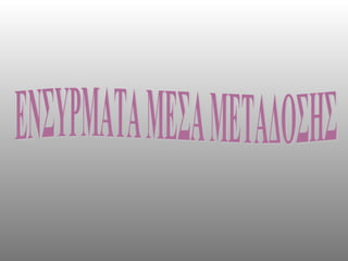 mesa metadosis 1. 2. 3. 4. 5. ΔΙΣΥΡΜΑΤΑ ΧΑΛΚΙΝΑ ΚΑΛΩΔΙΑ Καλώδιο Συνεστραμμένων Ζευγών UTP Καλώδιο Συνεστραμμένων Ζευγών FTP Καλώδιο Συνεστραμμένων Ζευγών STP 6. ΚΑΛΩΔΙΟ ΣΥΝΕΣΤΡΑΜΜΕΝΩΝ ΖΕΥΓΩΝ UTP Τηλεφωνικά δίκτυα Χαμηλό κόστος Εύκολη εγκατάσταση Ρυθμοί μετάδοσης έως 1 Gbps Καλύπτουν αποστάσεις έως 100 μέτρα 7. 8. ΚΑΛΩΔΙΟ ΣΥΝΕΣΤΡΑΜΜΕΝΩΝ ΖΕΥΓΩΝ UTP ΔΙΑΚΡΙΝΟΝΤΑΙ ΣΕ 5 ΚΑΤΗΓΟΡΙΕΣ CAT 1 VOICE ONLY (Telephone Talk) CAT 2 DATA TO 4Mbps (Local Talk) CAT 3 DATA TO 10Mbps (Ethernet) CAT 4 DATA TO 20 Mbps (16 Mbps Token Ring) CAT 5/5e DATA TO 100Mbps (Fast Ethernet) CAT 6 DATA TO 1Gbps (Gigabit Ethernet) Η CAT 5 συνιστάται συνήθως σε 10 Mbps Ethernet δίκτυα 9. 10. 11. 12. 13. ΟΜΟΑΞΟΝΙΚΟ ΚΑΛΩΔΙΟ Εύρος ζώνης τα 400 MHz Ανθεκτικό στην εξωτερική παρεμβολή Χρησιμοποιείται για αποστάσεις 300-600 μέτρα Χαμηλό κόστος 14. 15. ΚΑΛΩΔΙΟ ΟΠΤΙΚΗΣ ΙΝΑΣ Μεγάλο εύρος ζώνης Ανοχή στο θόρυβο Μικρό μέγεθος και βάρος Μικρή εξασθένηση σήματος Υψηλό κόστος 16. ΚΑΛΩΔΙΟ ΟΠΤΙΚΗΣ ΙΝΑΣ Προστασία έναντι ηλεκτρομαγνητικών παρεμβολών Ασφαλές μέσο μετάδοσης Δύσκολη εγκατάσταση Υψηλή προσαρμογή και ευθυγράμμιση φωτεινής πηγής 17. ΚΑΛΩΔΙΟ ΟΠΤΙΚΗΣ ΙΝΑΣ Πολύτροπες οπτικές ίνες Οπτική ίνα διακριτού δείκτη Οπτική ίνα βαθμιαίου δείκτη Μονότροπες οπτικές ίνες 18. BLOG Είναι ένα μέρος του blog μου που δείχνει ποια είναι τα δισύρματα χάλκινα καλώδια 19. 20. 21. 22. 23. 24. 25. 26. 27. 28. ΒΑΘΜΟΛΟΓΗΣΗ ΣΕ ΚΛΙΜΑΚΑ (1-10) 9 ΓΕΝΙΚΗ ΒΑΘΜΟΛΟΓΙΑ ΕΡΓΑΣΙΑΣ ΚΑΤΑΝΟΗΣΗ ΤΟΥ ΑΚΡΟΤΗΡΙΟΥ 10 ΚΑΤΑΝΟΗΣΗ ΤΟΥ ΘΕΜΑΤΟΣ ΑΠΟ ΕΜΑΣ ΠΡΟΦΟΡΙΚΗ ΣΑΣ ΠΑΡΟΥΣΙΑΣΗ 7 ΗΛΕΚΤΡΟΝΙΚΗ ΠΑΡΟΥΣΙΑΣΗ 29. ΒΙΒΛΙΟΓΡΑΦΙΑ [1] Παναγιωτόπουλος – Δραγώνας – Σκουρλάς, Τηλεπληροφορική και Δίκτυα Υπολογιστών, Εκδόσεις Νέων Τεχνολογιών, 1η Έκδοση, Αθήνα, 1994. [2] Μαρκασιώτης, Δίκτυα Υπολογιστών, Β. Γκιούρδας Εκδοτική, Αθήνα, 2004. [3] Groth – McBee , Ο πλήρης οδηγός εγκατάστασης δικτύων, Εκδόσεις Γκιούρδας, Αθήνα, 2000. [4] Τσιλιγκρίδης – Αλεξίου – Μπούρας – Μαμαλούκας – Αγγελόπουλος, Μετάδοση Δεδομένων και Δίκτυα Υπολογιστών Ι & ΙΙ, Τόμος Ι, Παιδαγωγικό Ινστιτούτο, Αθήνα, 2000. [5] Τσιλιγκρίδης – Αλεξίου – Μπούρας – Μαμαλούκας – Αγγελόπουλος, Μετάδοση Δεδομένων και Δίκτυα Υπολογιστών Ι & ΙΙ, Τόμος ΙΙ, Παιδαγωγικό Ινστιτούτο, Αθήνα, 2000. 30. ΒΙΒΛΙΟΓΡΑΦΙΑ [6] http :// egnatia . ee . auth . gr /~ adexioy / fiber - op . htm , 21 Απριλίου 2007. [7] http :// ngia . rootforge . org / couteut / Tutorials / PlugMeIn / UTP . htm , 26 Απριλίου2007. [8] http :// www . e - shop . gr / searcth _ per . phtml , 30Απριλίου 2007. [9] http :// www . pixmania . com . cy / cy / gr /16671/ ar / hama / network _ cat _ cable _ se _ flex . html , 2 Μαΐου 2007. [10] http :// www . expansys . com . gr / p . asp , 2 Μαΐου 2007. [11] Αξούργος – Μόσιαλου, Σημειώσεις Διαχείριση Δικτύων, ΤΕΙ Ηπείρου, σελ. 7-15, Δεκέμβριος 2006. [12] http :// www . fastnetradio . gr / view - prod . php ? , 3 Μαΐου2007. [13] http :// www . djshop . gr / ProductList . asp ? ITMIP =10535 , 3 Μαΐου2007 31.