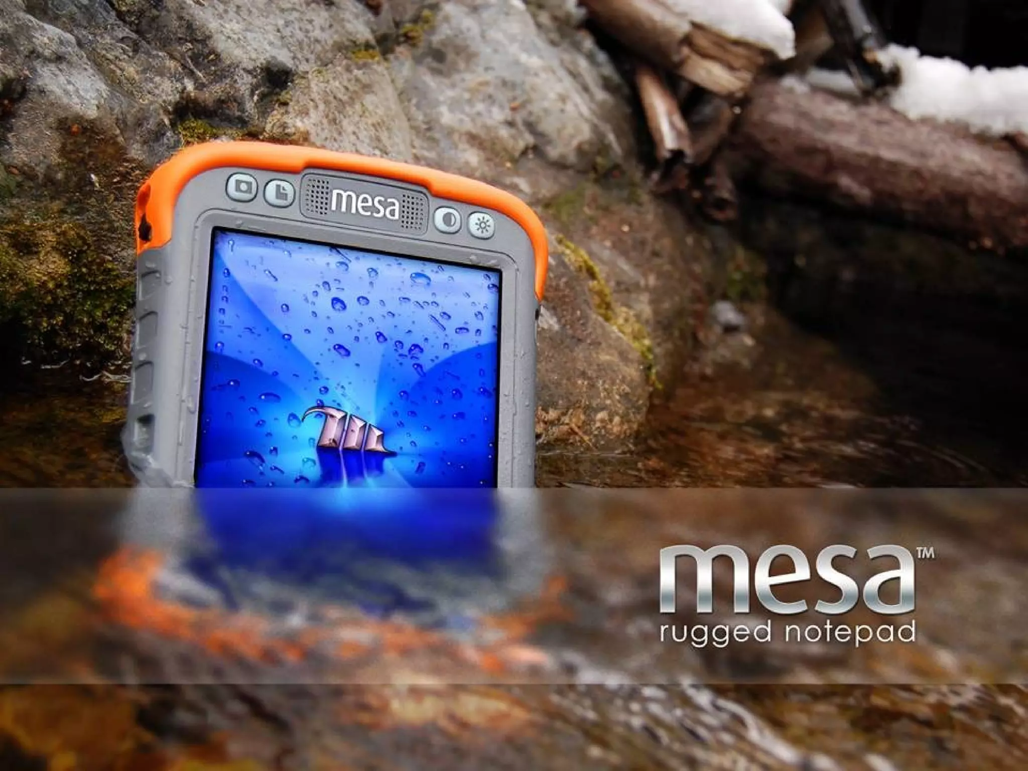 The Mesa Rugged Notepad is a rugged tablet PC and handheld device that can withstand harsh environments. It has a 5.7-inch touchscreen, Windows Mobile 6.5 operating system, and up to 8 hours of battery life. Additional features include Bluetooth, WiFi, GPS, and optional 3G connectivity. The Mesa is designed to be durable yet easy and comfortable to use in the field.