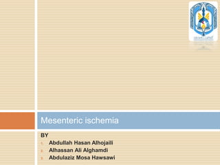 The document discusses mesenteric ischemia, which is characterized by inadequate blood supply to the intestines, and can be classified into chronic and acute forms. Chronic mesenteric ischemia typically affects women and presents symptoms like post-prandial pain and weight loss, while acute mesenteric ischemia is life-threatening and often results from embolic or thrombotic events. Diagnosis involves imaging and laboratory tests, with management primarily focused on surgical revascularization and medical therapy where appropriate.
