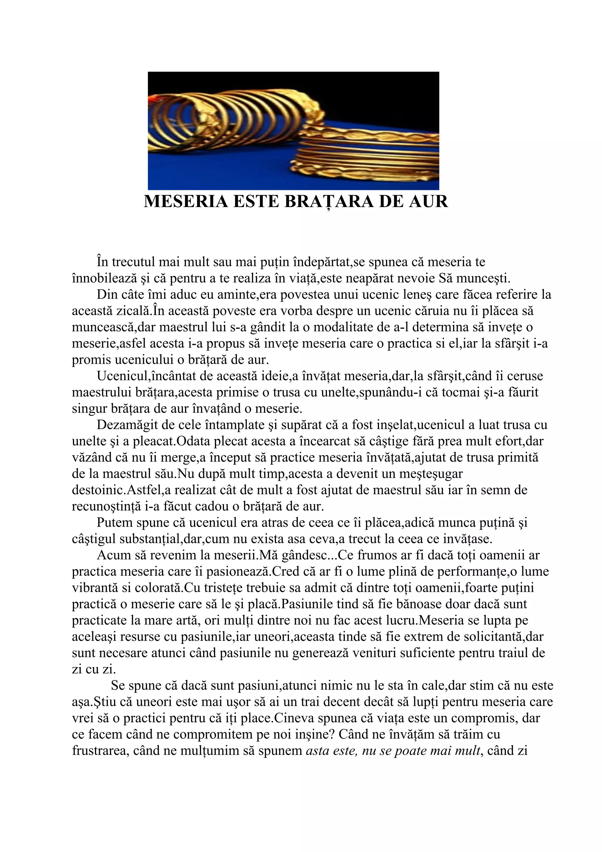 Documentul discută despre importanța meseriei și despre cum aceasta poate determina succesul și realizarea personală. Povestea unui ucenic leneș evidențiază cum munca și învățarea pot transforma o persoană, iar exemplul lui Mihai Eminescu ilustrează fulfilment-ul prin urmarea pasiunii. Autorul subliniază că, deși mulți nu își aleg meseria dorită, stăpânirea acesteia oferă o satisfacție mai mare decât orice avere materială.