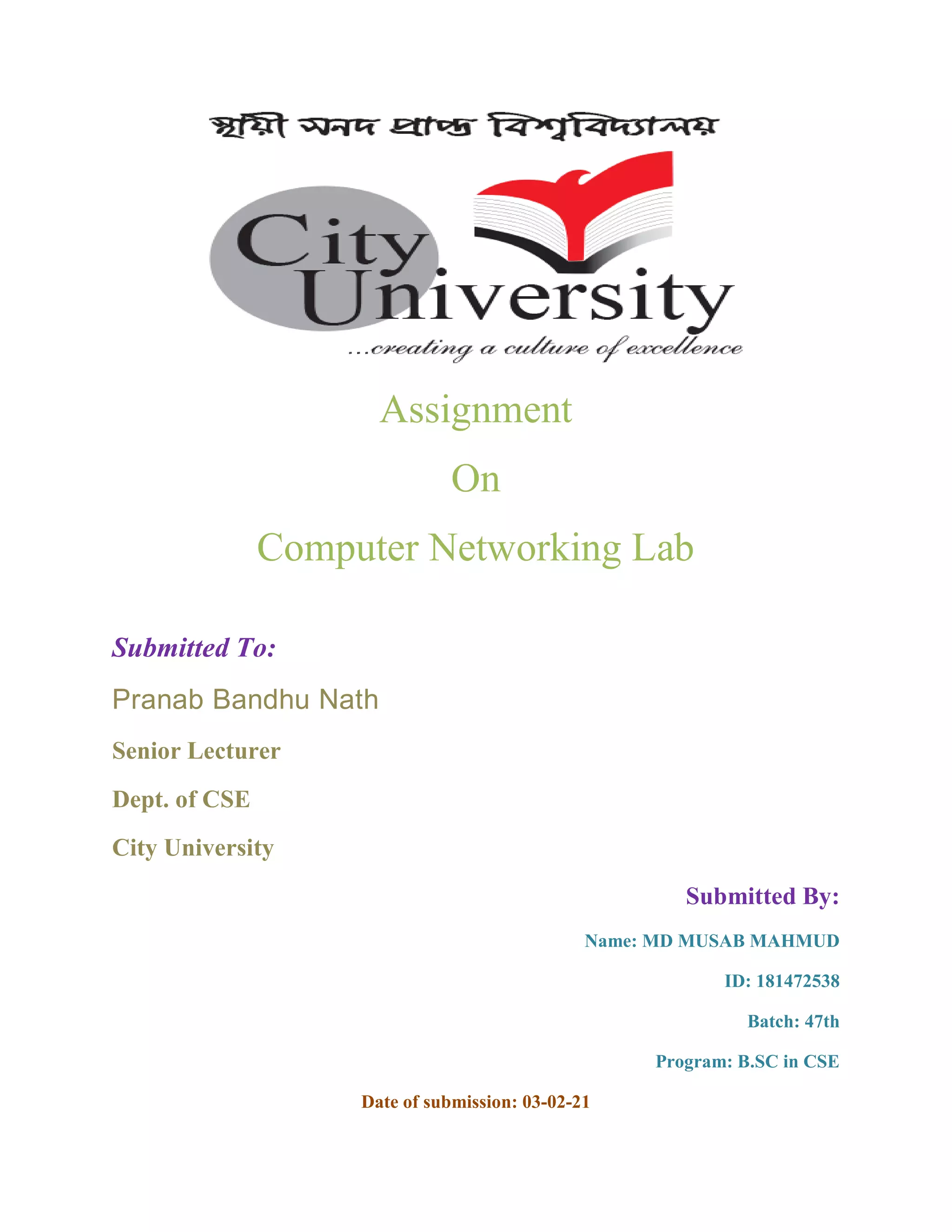 This 3 sentence summary provides the essential information from the document: The document is a lab assignment submission for a computer networking course submitted by MD Musab Mahmud with ID 181472538 from the 47th batch of the B.Sc. in CSE program to lecturer Pranab Bandhu Nath in the Department of CSE at City University, and it details an experiment completed on February 3rd, 2021 configuring a mesh topology using Cisco devices.