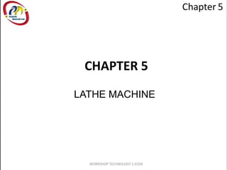The document provides information about workshop technology 1 and the centre lathe machine. It discusses the objectives, introduction, parts of the lathe machine including the bed, carriage, tool post, and headstock. It also describes workholding devices such as chucks and collets. It explains tool bits including shapes, angles, and materials. Finally, it lists common lathe machine operations such as turning, boring, facing, drilling, knurling, and thread cutting.