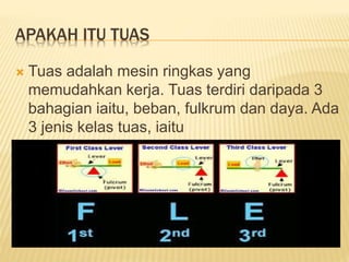 Tuas adalah mesin ringkas yang terdiri daripada tiga bahagian: beban, fulkrum, dan daya, yang memudahkan kerja. Terdapat tiga jenis kelas tuas, dan banyak alat dalam kehidupan seharian direka berdasarkan prinsip tuas. Contoh alat tersebut termasuk dacing.