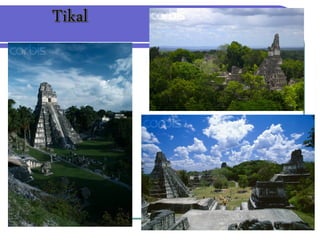 The Olmec were the first civilization in Mesoamerica, located along the Gulf of Mexico coast. They built large cities and were centers of religion, carving colossal stone heads to represent rulers or gods. Mesoamerica was home to three major pre-Columbian civilizations - the Maya, Aztecs, and Incas. The Maya flourished from 300-900 CE in modern Guatemala and Honduras, building immense city-states centered around pyramids topped with shrines. They had advanced achievements in astronomy, mathematics, and a complex writing system. The Aztecs rose to power in central Mexico from 1400-1520 CE, establishing the island city of Tenochtitlan,