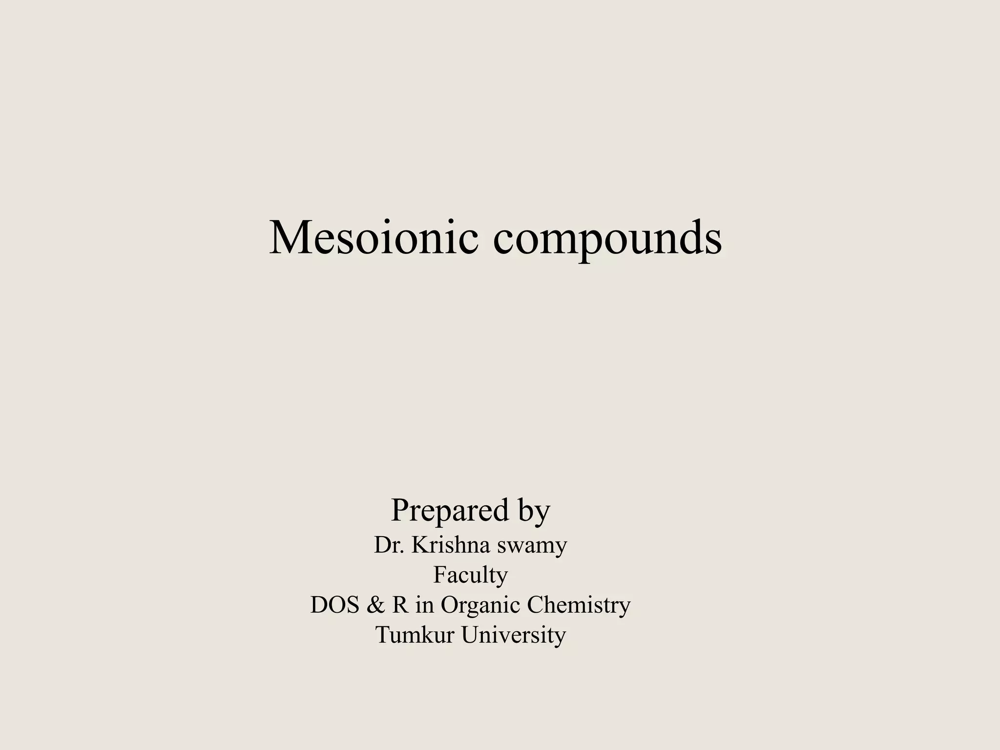 Mesoionic compounds are heterocyclic compounds with delocalized positive and negative charges that cannot be represented by any single covalent or polar structure. Sydnone and munchnone are two representative mesoionic compounds. Sydnone, the most extensively studied mesoionic compound, undergoes substitution reactions and 1,3-dipolar cycloaddition reactions. It can also undergo ring cleavage to form monosubstituted hydrazines.