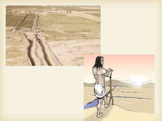 The document provides an overview of Mesopotamia, the world's first civilization. Mesopotamia was located between the Tigris and Euphrates Rivers in a region known as the Fertile Crescent. The predictable flooding of the rivers provided rich soil for agriculture, allowing cities and complex societies to develop. One of the earliest civilizations was the Sumerians in southern Mesopotamia, who invented writing, developed irrigation for agriculture, and established independent city-states.