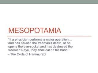 The document provides an overview of the Sumerian civilization that originated in Mesopotamia between the Tigris and Euphrates Rivers in modern-day Iraq. The Sumerians developed the first extensive urban civilization, supported by irrigation farming. They created many cultural innovations, including the first system of writing, monumental architecture, irrigation systems, schools, use of bronze, and the wheel. Their achievements laid the foundations for later Mesopotamian empires like Akkad and Babylon. The document also discusses Sumerian religion, social structure, law, and their eventual decline after conquest by successive empires.