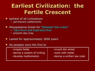 Mesopotamia, located between the Tigris and Euphrates Rivers in modern-day Iraq, was the site of some of the earliest human civilizations beginning around 3500 BCE. It had a favorable environment for agriculture due to natural levees and floodplains created by seasonal flooding. Mesopotamian civilizations such as the Sumerians, Akkadians, Babylonians, and Assyrians developed systems of irrigation, law, writing, mathematics, and organized religion centered around gods like Ishtar and Enki. Writing began as pictograms and evolved into the cuneiform script, while legal codes like Hammurabi's established early systems of law.