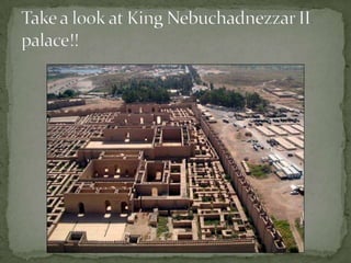 The document summarizes life in ancient Mesopotamia, known as the Fertile Crescent region encompassing modern Iraq, Syria, and Turkey. It describes the Sumerian civilization that emerged near Baghdad around 4000 BCE and the later Akkadian, Assyrian, and Babylonian peoples that ruled parts of Mesopotamia. The document outlines aspects of daily life like housing, gender roles, clothing, and recreation. It also discusses the development of laws under King Hammurabi and the importance of kings who were believed to be chosen by the gods.
