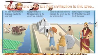 The document outlines the history and characteristics of ancient Mesopotamian civilizations, including Sumerians, Akkadians, Babylonians, Assyrians, and Persians. It describes key structures like ziggurats, the agricultural-based economy, social hierarchies, and significant historical figures such as Hammurabi and Sargon. The text emphasizes the development of city-states, trade, and innovations like the law code and unit measurements in this early region of civilization.