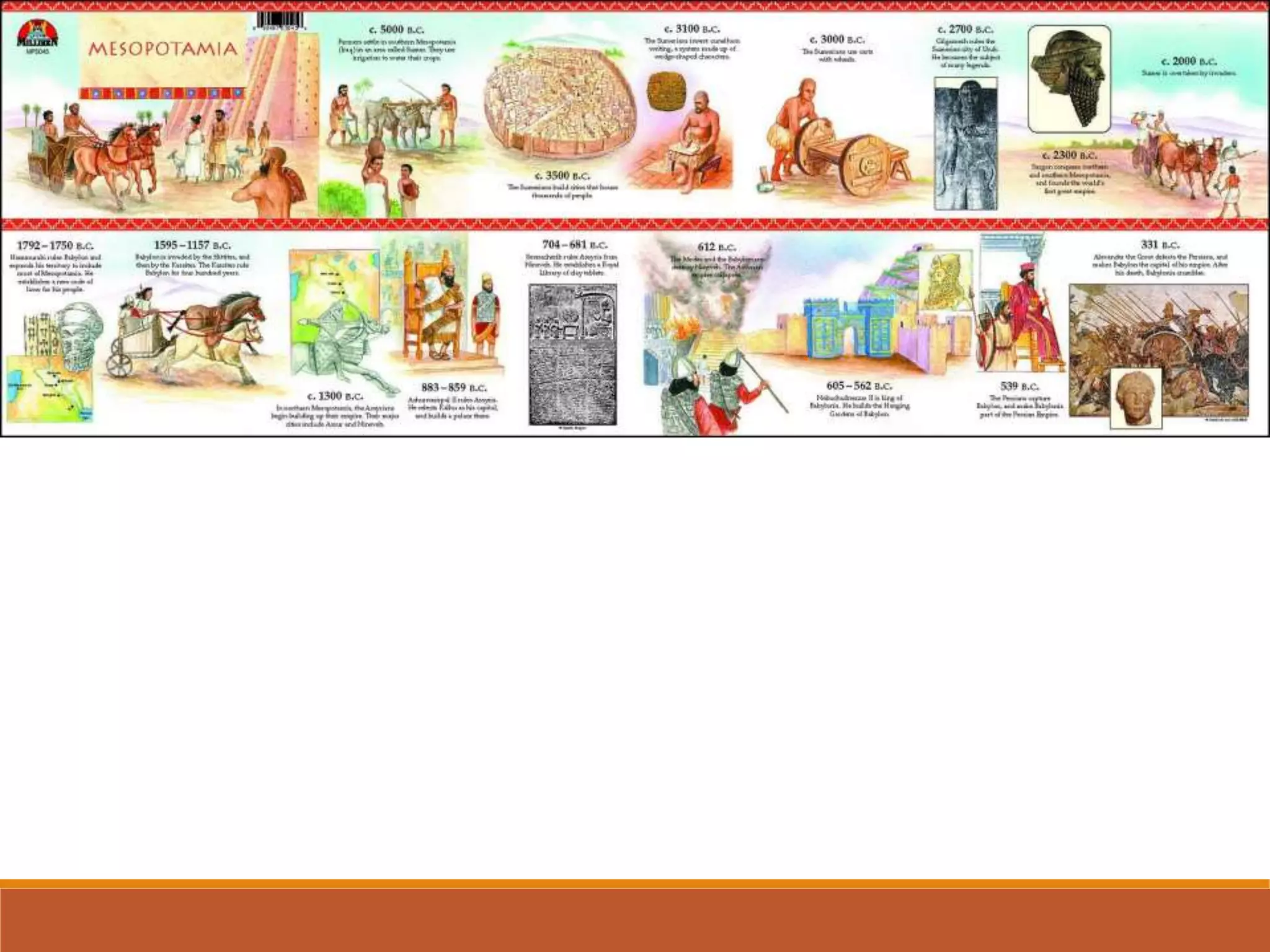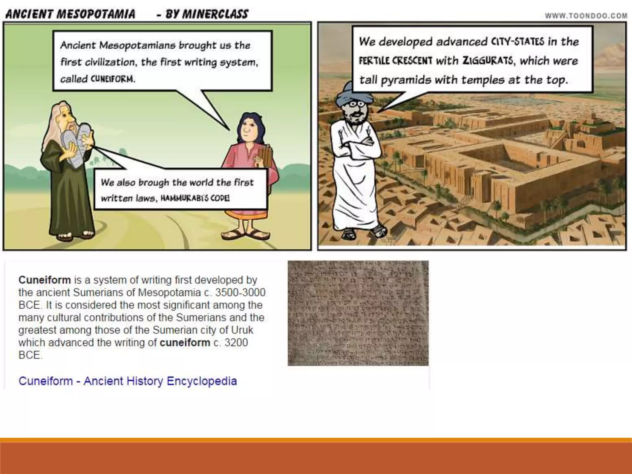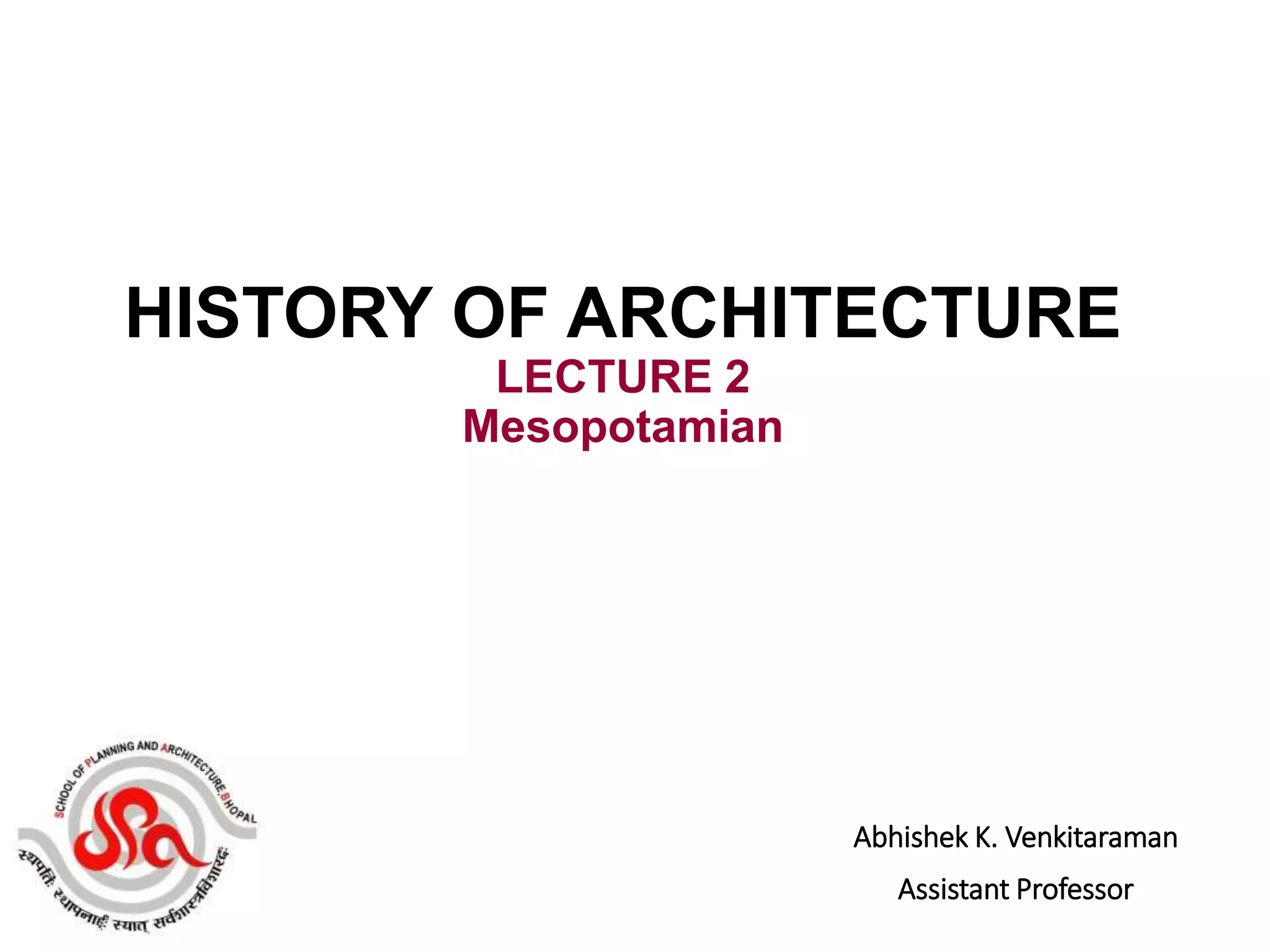 This lecture provides an overview of early Mesopotamian civilization between the Tigris and Euphrates Rivers. It discusses the geography and climate of the region, known as the Fertile Crescent, which allowed for the development of irrigation-based agriculture and urban settlements. Sumerians were the first to settle the region around 5000 BC, developing dams, canals and cities like Uruk and Ur. Writing and other innovations emerged as cities grew in size and complexity between 3500-3000 BC. Social classes and kingship developed, with temples becoming important religious and administrative centers marked by ziggurats.