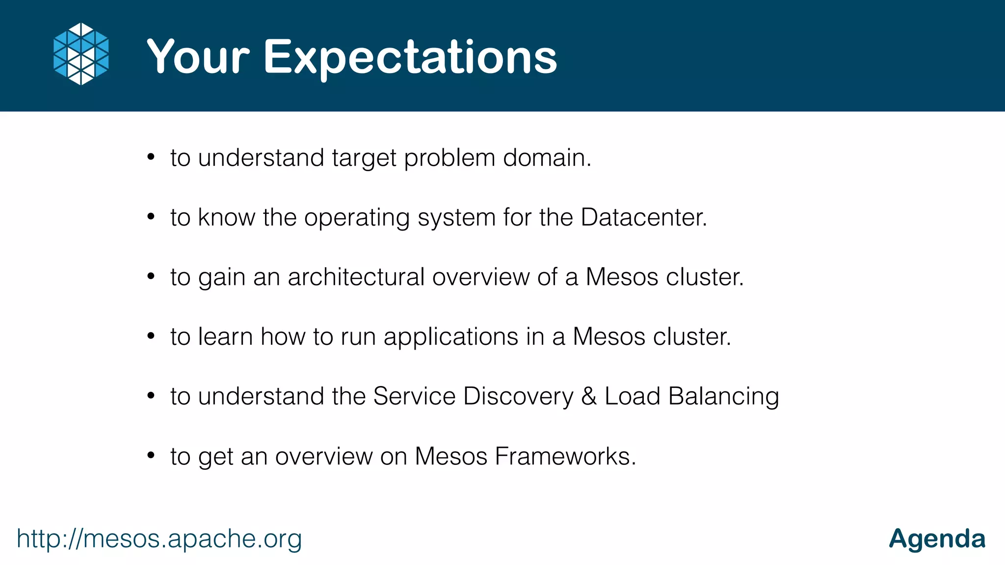Mesos is an open source cluster management framework that provides efficient resource isolation and sharing across distributed applications or frameworks. It divides resources into CPU, memory, storage, and other compute resources and shares those resources dynamically and efficiently across applications. Mesos abstracts the underlying infrastructure to provide a unified API to applications while employing operating system-level virtualization through interfaces like Docker to maximize resource utilization. It works by having a Mesos master that negotiates resources among Mesos slaves to run applications or frameworks, which are made up of a scheduler to negotiate for resources and executors to run tasks. Common frameworks that run on Mesos include Spark, Hadoop and Docker containers.