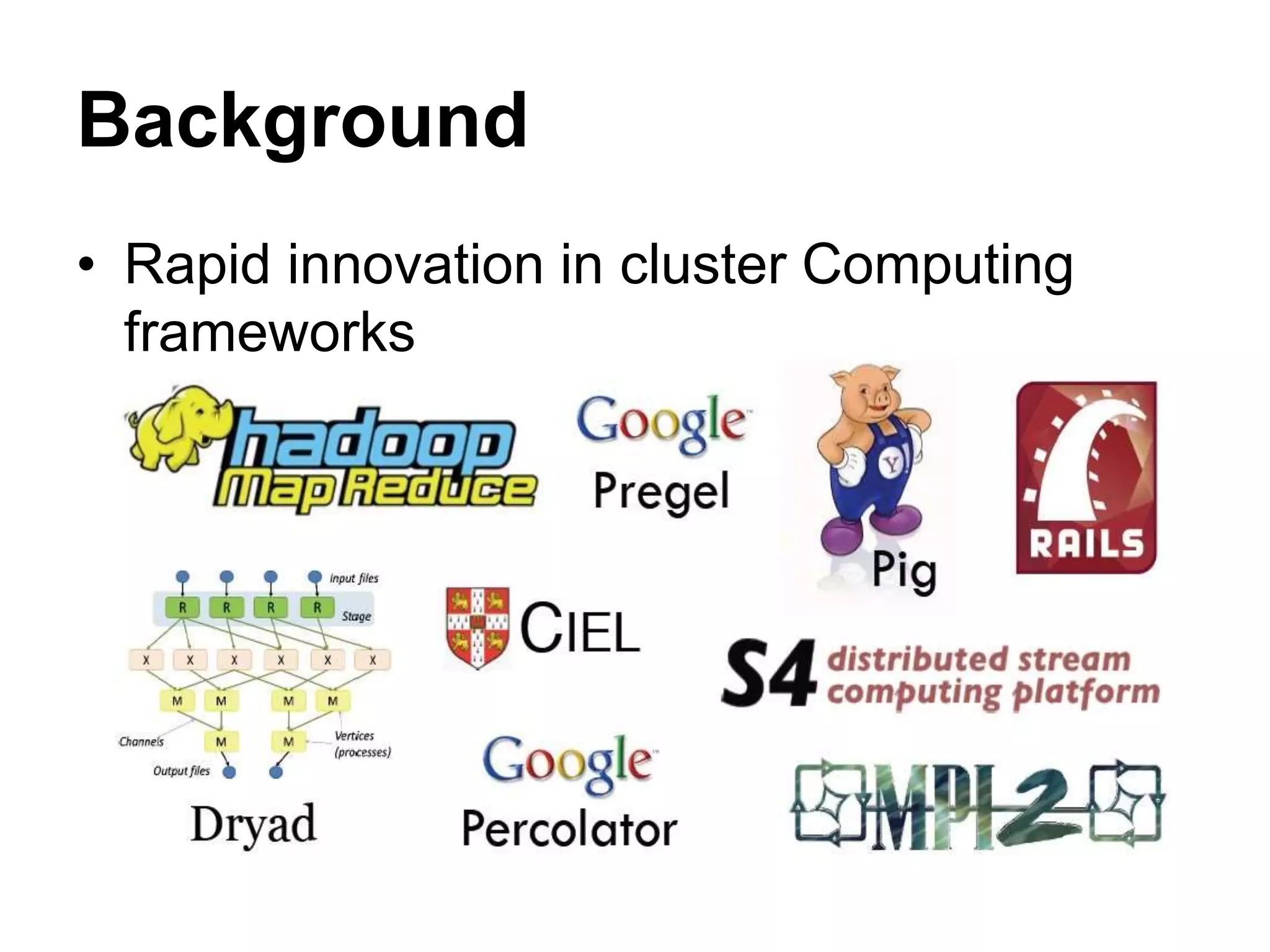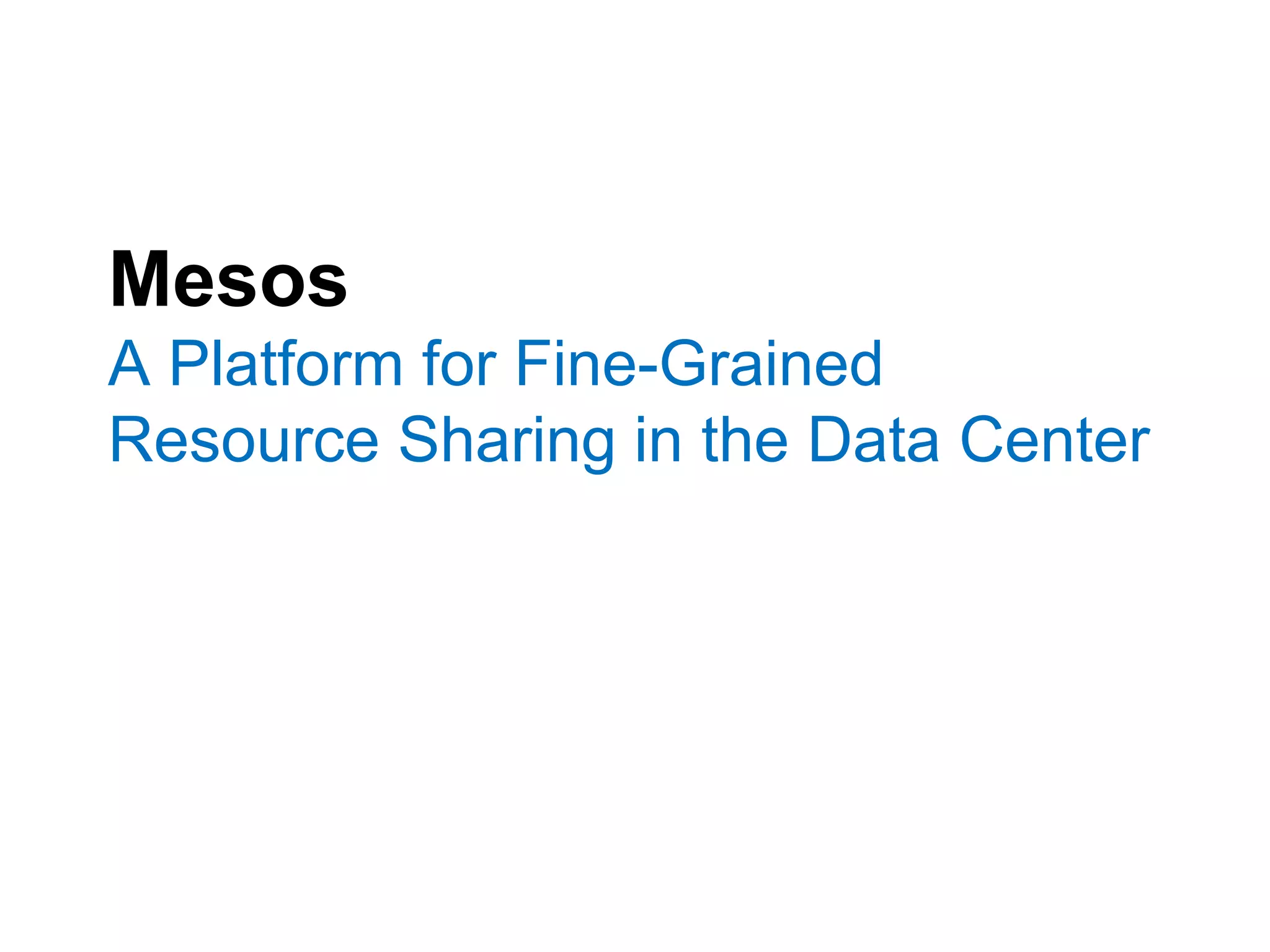 Mesos is a platform that enables sharing of cluster resources between different frameworks. It achieves this through a two-level resource sharing approach: 1) Mesos manages coarse-grained sharing of resources like CPUs and memory between frameworks; 2) Frameworks control fine-grained sharing of tasks within their allocated resources. Mesos's use of resource offers allows frameworks to dynamically accept or reject resources based on their needs, improving cluster utilization. It has been used successfully at large companies to share resources between frameworks like Hadoop and Spark.