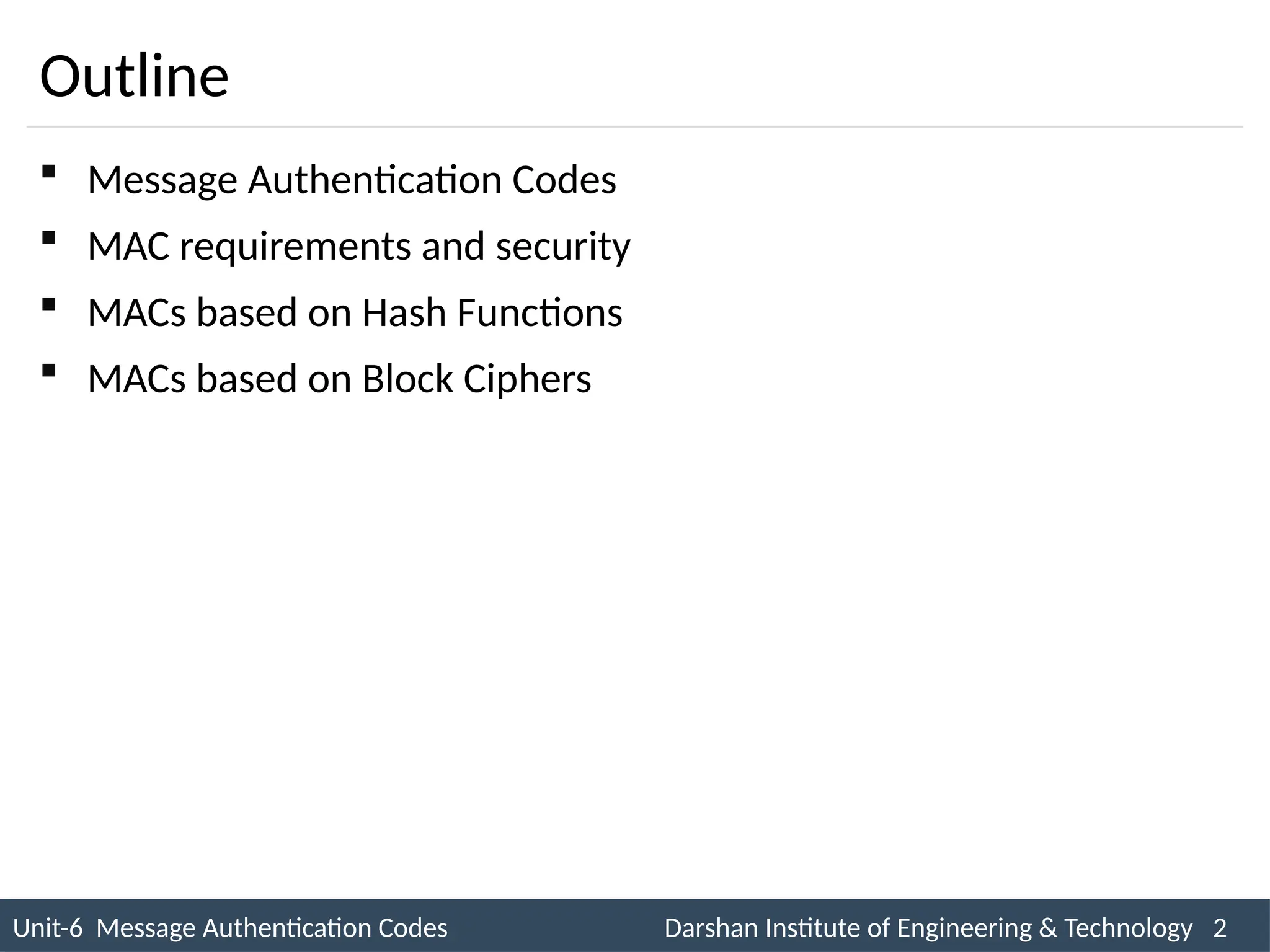 The document outlines message authentication codes (MACs), focusing on their purpose to verify message integrity and authenticity. It discusses the requirements for message authentication, techniques involving hash functions like HMAC, and block cipher-based approaches such as CMAC. The text details the processes involved in generating and utilizing MACs to ensure secure communication between parties.