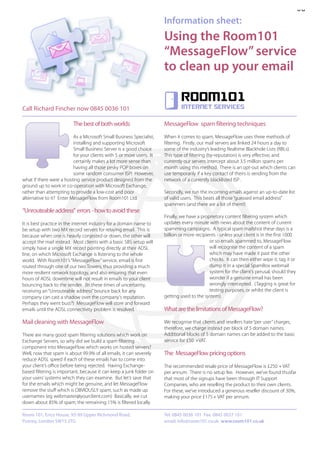 MessageFlow is a spam filtering service from Room101 that routes email through its servers before delivering to clients. It uses real-time blacklists, valid user checks, and proprietary content filtering to block around 99% of spam, reducing strain on clients' networks. MessageFlow also provides increased email reliability by storing messages if the client's connection is down. Pricing is £250 per year per client, or £175 for resellers.