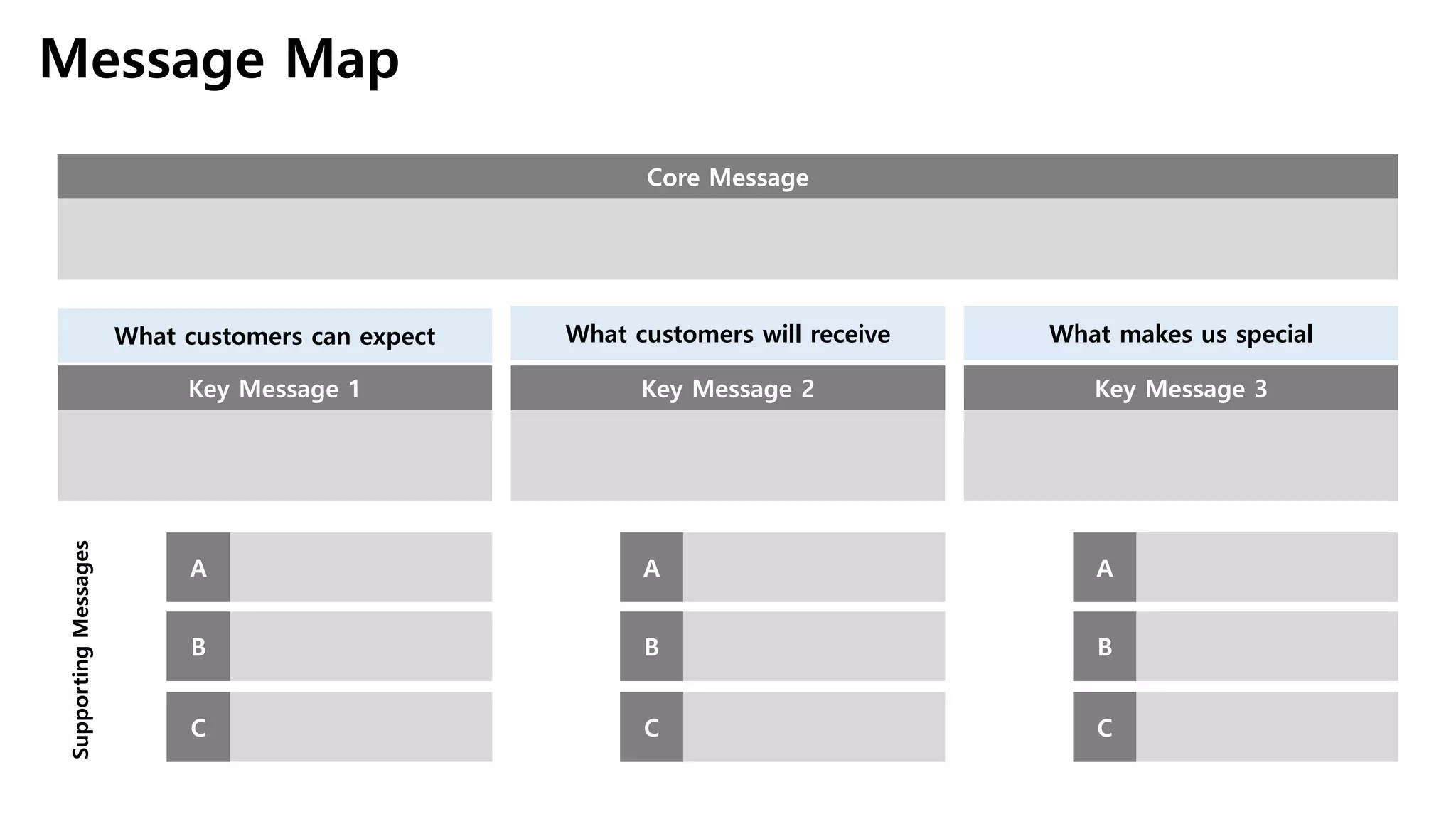 This document contains a message map to communicate key messages to customers. The core message is at the top level, with three key messages below providing details on what customers can expect, what they will receive, and what makes the company special. Each key message then has three supporting messages to further explain and emphasize the main points.
