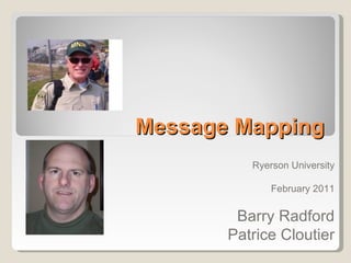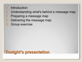 The document discusses message mapping as a crisis communication technique. Message mapping involves developing 3 key messages for different audiences, with each key message supported by 3 sub-points. It is based on research showing people can only process 3 pieces of information at a time during a crisis. The document provides an example message map addressing a water contamination threat and outlines best practices for crafting, ordering, and delivering message maps to different audiences during an emergency situation.