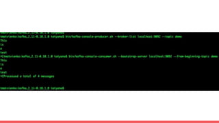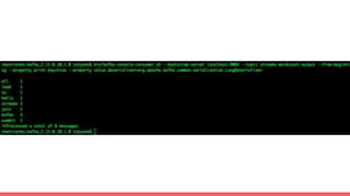 The document provides instructions for demonstrating message queues using Apache Kafka and RabbitMQ. It explains how to start the required servers, create topics and producers, and process streaming data using Kafka Streams. It also covers starting RabbitMQ, sending and receiving messages, exchange types for routing, and different client types.