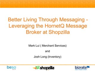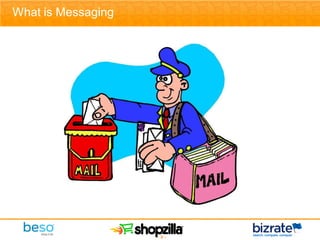 This document discusses messaging and the HornetQ messaging broker. It provides an overview of messaging and its uses in enterprise application integration. It then describes features of message queues and HornetQ specifically. The document discusses using HornetQ for high availability and clustering. It also covers using the Spring framework with HornetQ and examples of how Shopzilla uses HornetQ for its Merchant Services and Inventory services.
