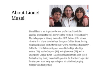 Lionel Messi is considered one of the greatest footballers of all time. He was born in Argentina and joined Barcelona's youth academy at age 13 after being diagnosed with a hormone deficiency. He went on to become Barcelona's all-time leading scorer and won numerous championships and awards, including 5 Ballon d'Or trophies. Off the field, Messi established a charity foundation to support children's healthcare and education.