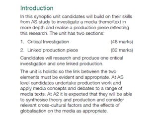This document provides guidance for students on a media research and production course assignment. The assignment requires students to complete both a critical investigation paper of 2000 words and a linked media production piece. For the critical investigation, students must explore a contemporary text, theme, issue or debate and present their research individually in a written report or alternative format. They are encouraged to develop their own interests and expertise in their topic. The linked production piece can be a video, audio, print or digital media piece no longer than 5 minutes that relates to the topic explored in the critical investigation. Students have several weeks to develop initial ideas and can work individually or in small groups. The document provides examples of past student topics and production ideas and tips for choosing a topic
