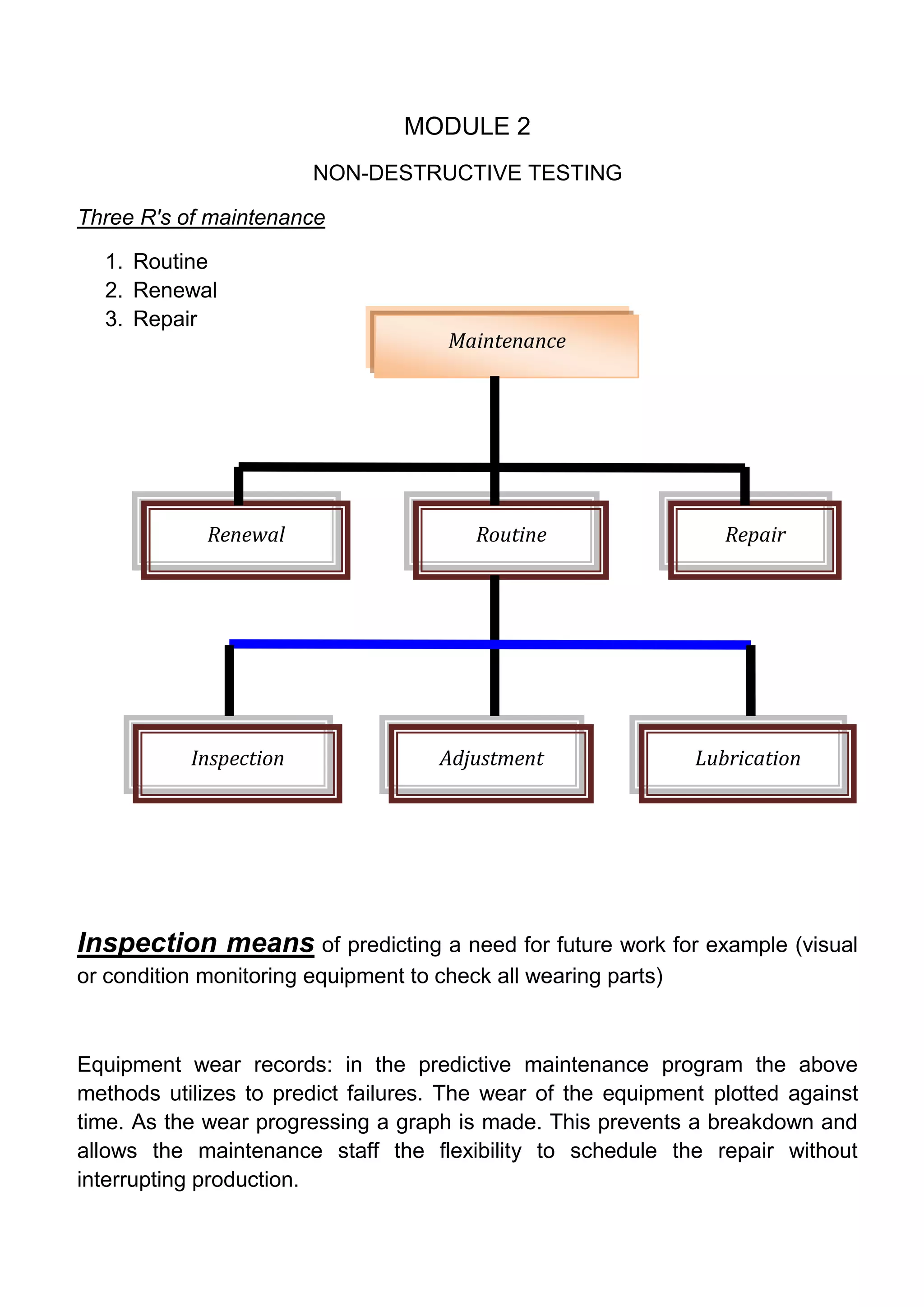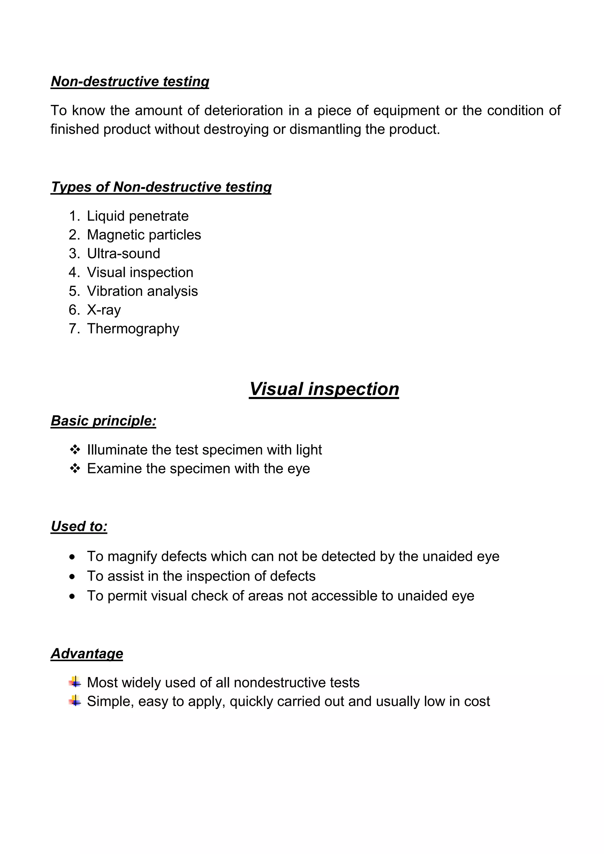 The document discusses various methods of non-destructive testing (NDT) used to inspect equipment and products for defects or deterioration without dismantling them. It describes common NDT techniques like visual inspection, liquid penetrate testing, magnetic particle testing, ultrasound testing, vibration analysis, infrared imaging, and X-ray testing. The techniques analyze factors like surface cracks, corrosion, material density variations, and component temperatures to predict failures and maintenance needs. NDT allows for safe inspection and condition monitoring to improve equipment reliability.