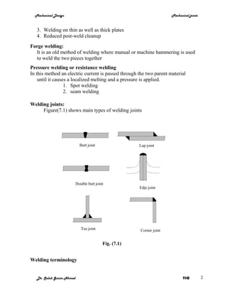 The document discusses various types of mechanical joints including welded joints. It describes common welding processes like oxy-fuel gas welding, shield metal arc welding, and gas tungsten arc welding. The document also covers welding joints, terminology, design considerations, stress analysis of welded joints under different loading conditions, and includes examples of calculating stresses in welded joints.