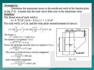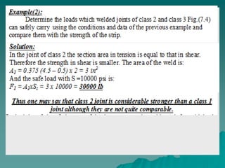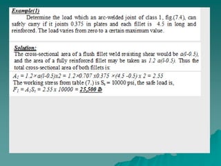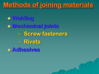 This document discusses mechanical joints and welding. It provides information on different types of mechanical joints like screws and rivets. It then discusses various welding processes like oxy-fuel gas welding, shield metal arc welding, and gas tungsten arc welding. Different welding joints are also illustrated like butt joints, lap joints, and tee joints. The document concludes with discussing welding terminology, classification of welding joints based on stress, and design considerations for welding joints.