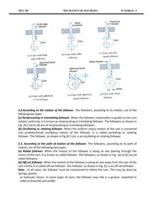 This document discusses different types of cams and cam mechanisms. It describes various types of followers based on their contacting surface, motion, and path of motion. It also defines important cam terminology used to describe cam profiles such as base circle, trace point, pressure angle, pitch point, pitch circle, and lift. The document provides examples of cam profiles that produce uniform velocity, simple harmonic, uniform acceleration/retardation, and cycloidal motions in the follower. It includes example problems of constructing cam profiles for different follower motions and specifications.