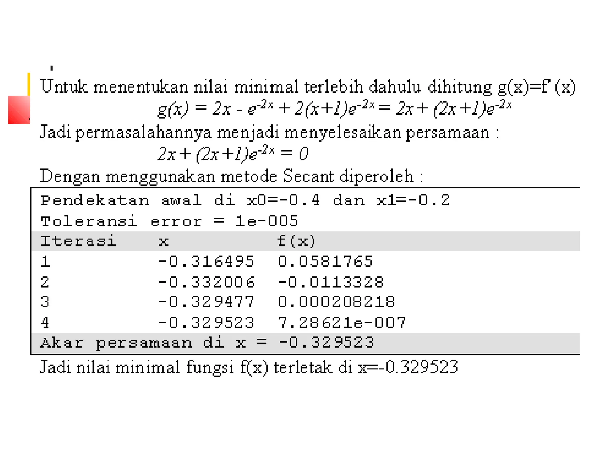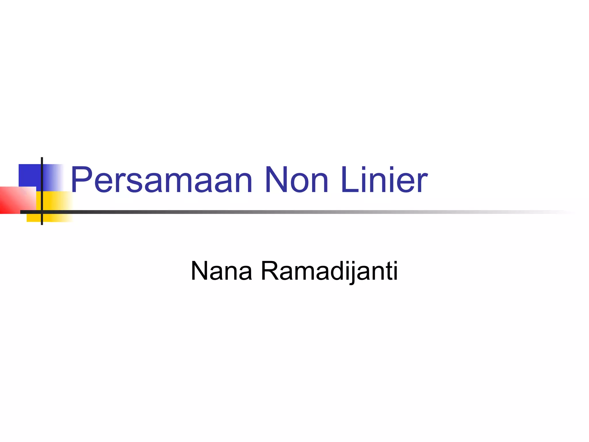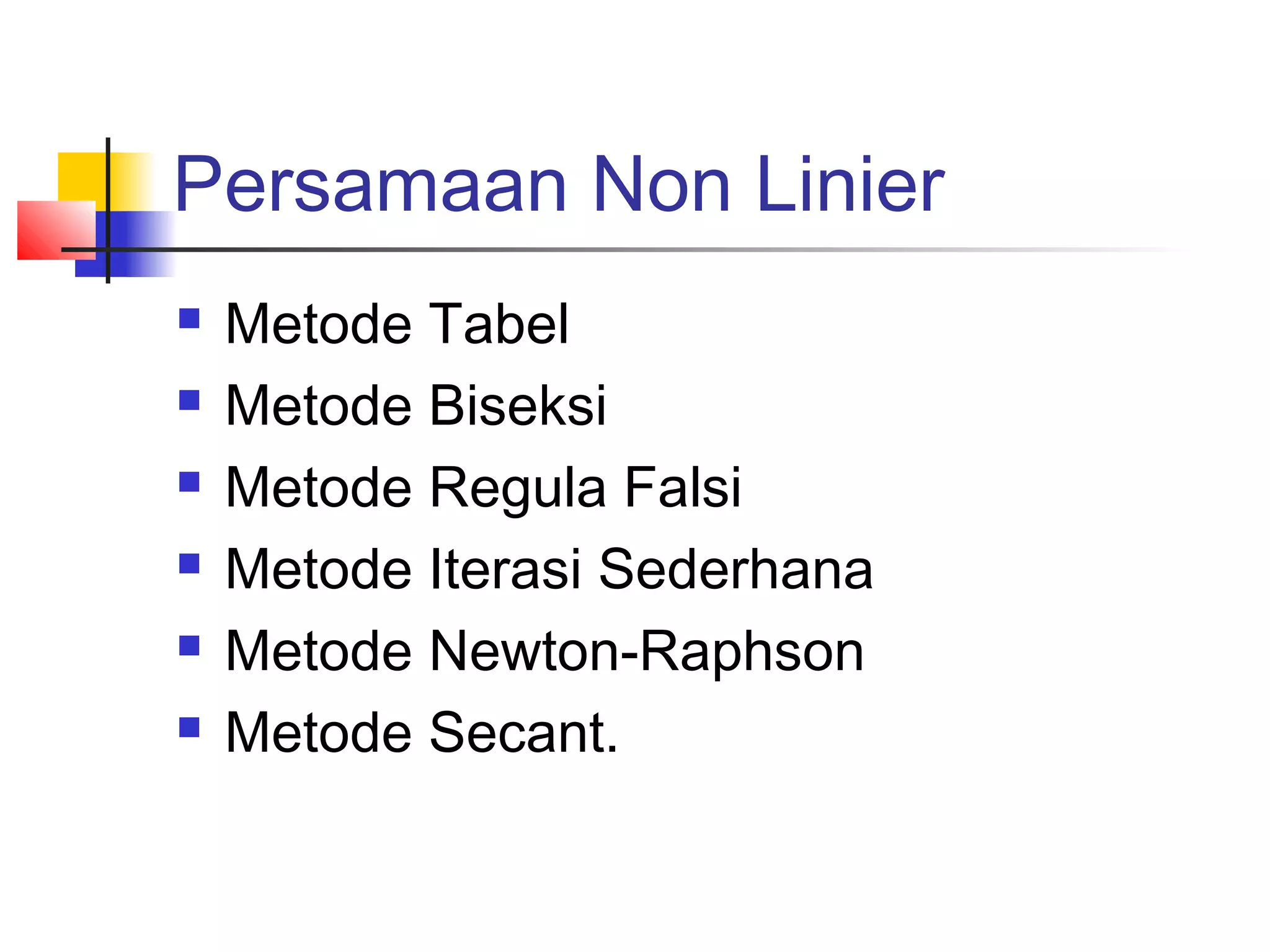 Dokumen ini membahas berbagai metode untuk menyelesaikan persamaan non linier, termasuk metode biseksi, regula falsi, iterasi sederhana, Newton-Raphson, dan secant. Masing-masing metode dijelaskan dengan algoritma, contoh aplikasi, serta kelebihan dan kelemahannya. Hal ini memberikan pemahaman dalam menemukan akar persamaan dengan pendekatan yang berbeda-beda.