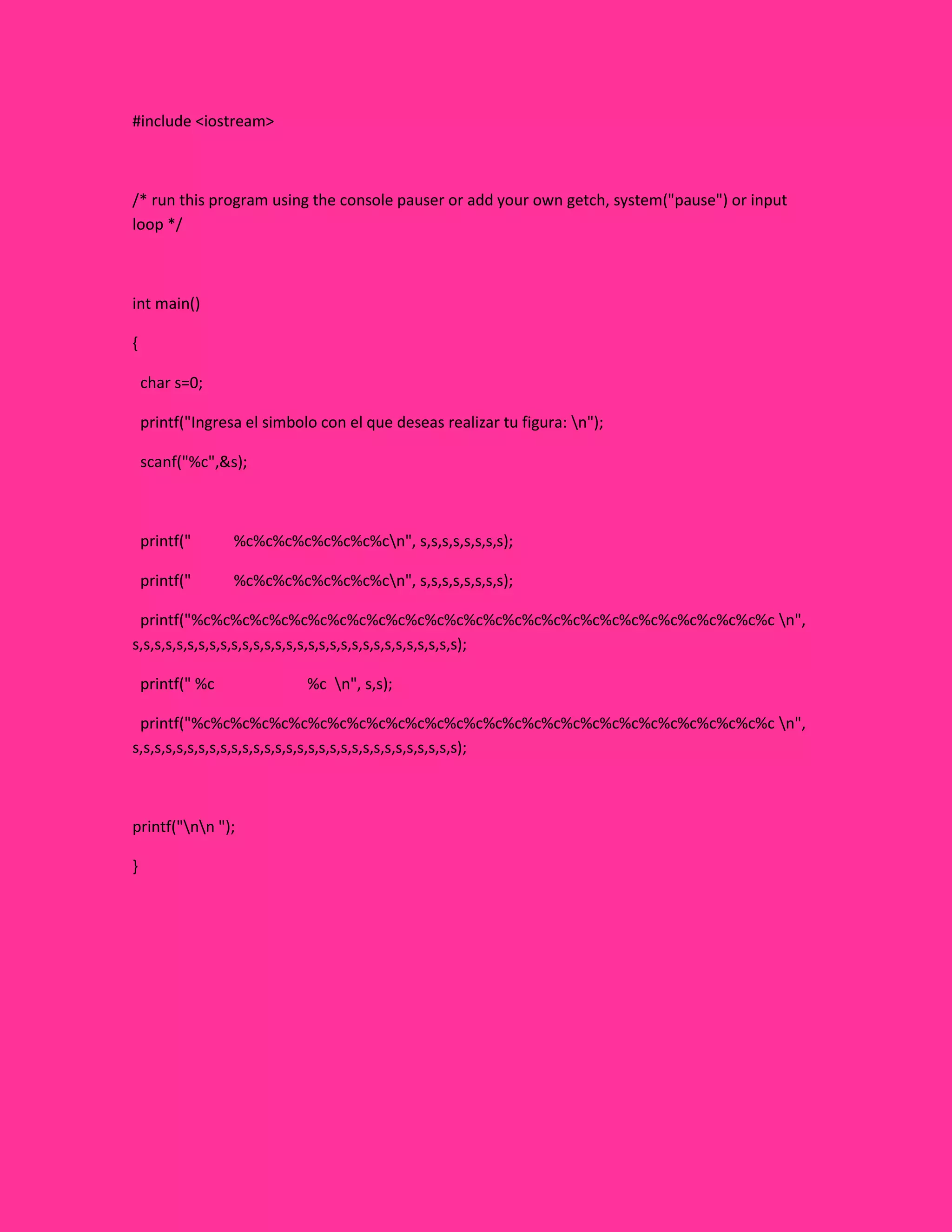 This C++ program allows a user to input a symbol and then prints out a figure made of that symbol in 5 lines of varying lengths. It prompts the user to enter a symbol, scans their input, and then prints the figure using that symbol across 5 lines with different numbers of repetitions of the symbol on each line to create the shape.