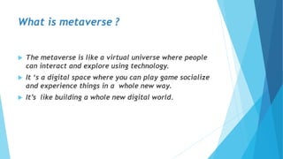 The metaverse is a virtual universe where people can interact and explore using technology like virtual reality, augmented reality, and blockchain-based assets. It allows users to play games, socialize, and experience things in new ways through digital spaces that combine virtual and physical environments. Key technologies that enable the metaverse include VR/AR, 5G networks, AI/ML, IOT devices, and NFTs to represent digital ownership. While the metaverse provides advantages like new social and commerce opportunities, it also faces challenges regarding privacy, security, and implementation costs.