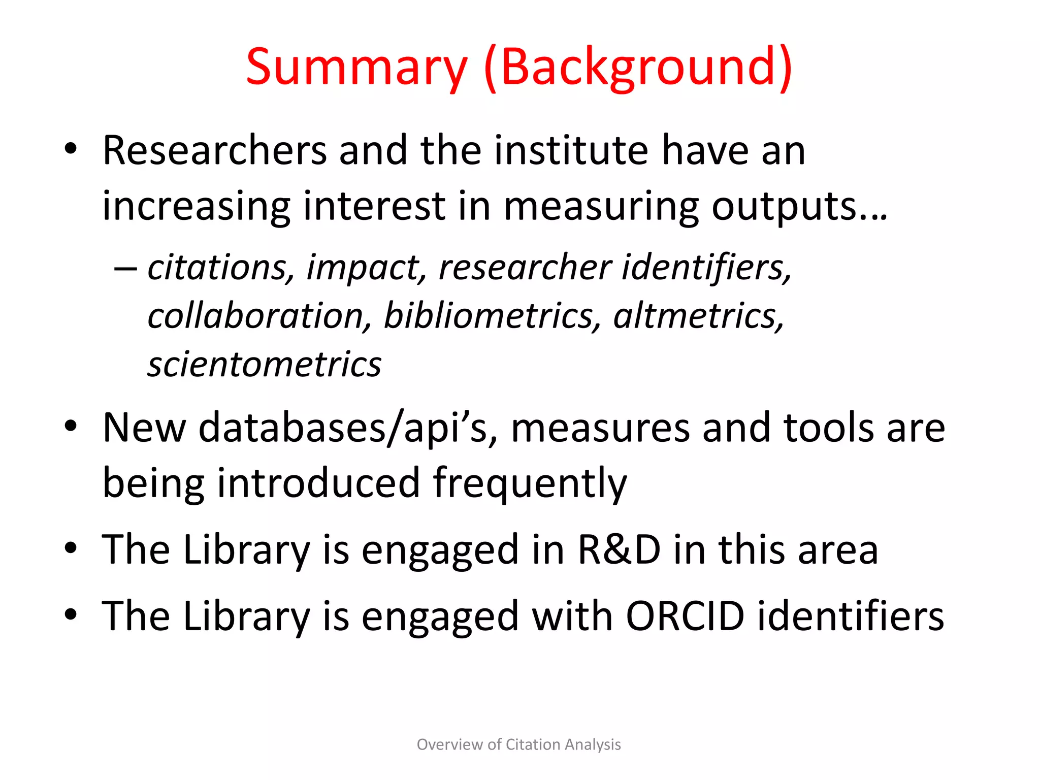 The document provides an overview of citation analysis meta-resources, highlighting the growing interest in measuring academic outputs such as citations and impact through new databases and tools. It discusses available resources, including LibGuides, bibliometrics course materials, and consultation services for researchers. The document also details opportunities for training and support related to citation analysis within the MIT libraries.