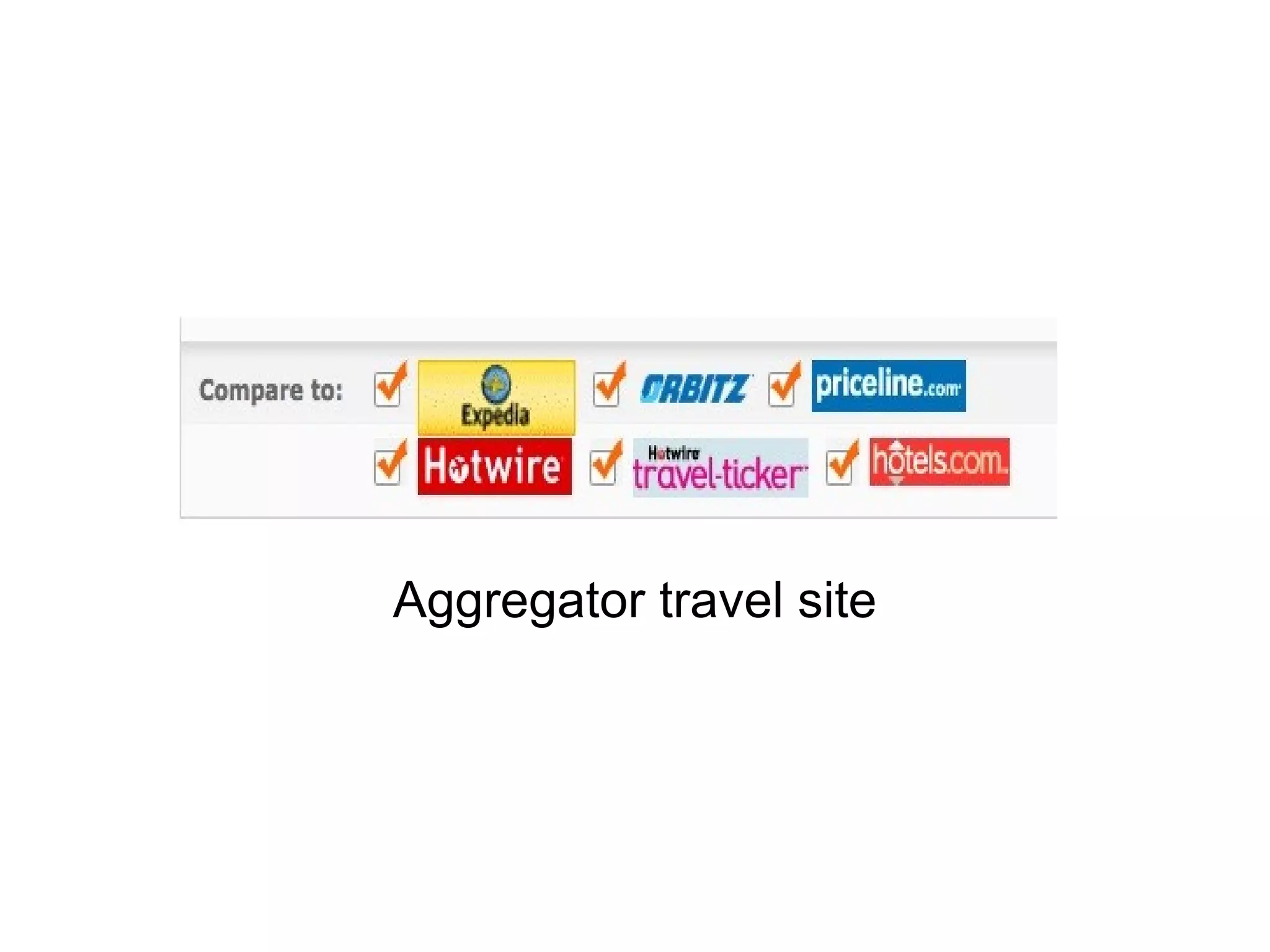 An aggregator travel site allows users to search across multiple online travel agencies (OTAs) to find the best rates for flights and hotels. The document compares Mobissimo and Yahoo! Travel, two major aggregator sites. Both sites search across many OTAs to display results but Mobissimo focuses more on Europe while Yahoo! Travel has a broader international reach. The document also lists the OTAs and travel partners included in each site's searches to provide users the most comprehensive comparison of rates.