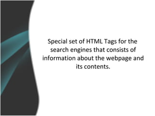 Meta tags provide important information about a webpage to search engines through special HTML tags, including the robot meta tag, keywords meta tag, and description meta tag. Surya's International Inc offers more information about meta tags and search engine optimization and marketing through their contact information.