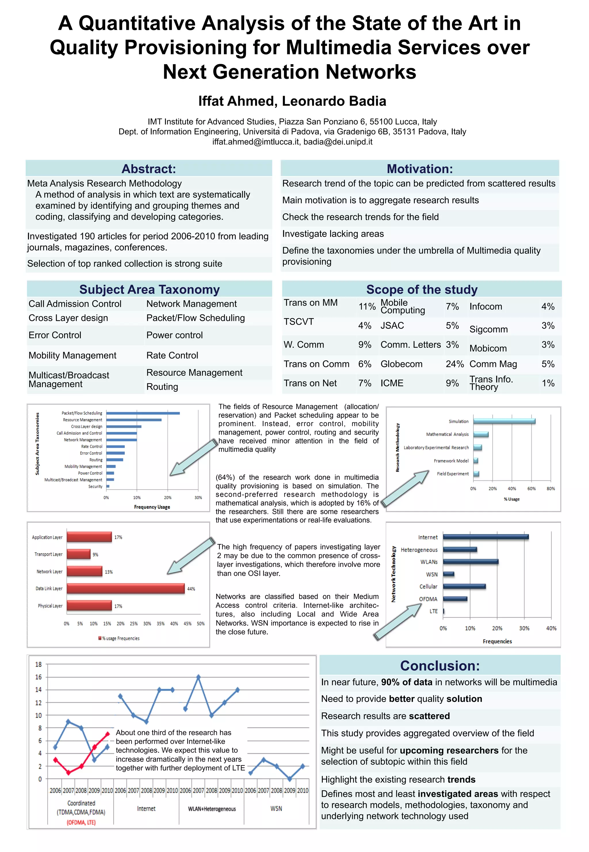 This document analyzes 190 research articles on quality provisioning for multimedia services over next generation networks from 2006-2010. It finds that resource management and packet scheduling received the most attention, while areas like error control and mobility management received less. Simulation was the most common research methodology. About a third of research focused on Internet-like networks, though this share is expected to increase with LTE deployment. The analysis aims to provide an aggregated overview of the field and highlight trends to help guide future research.