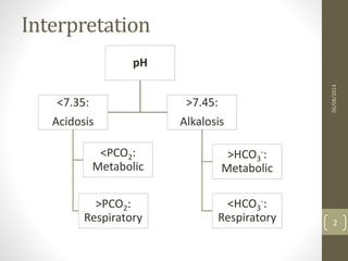 This document discusses acid-base imbalances, including their interpretation based on pH, PCO2 and HCO3 levels. It describes the causes and types of metabolic and respiratory acidosis and alkalosis. Anion gap is explained as a way to determine the cause of acid-base imbalances. Causes of large, normal and small anion gap metabolic acidosis are provided. Compensated versus uncompensated acid-base imbalances are also summarized. Oxygen delivery methods and the management of type 2 diabetes mellitus are briefly covered.