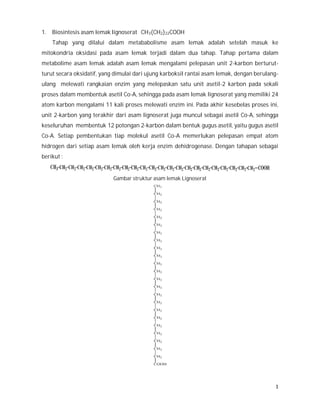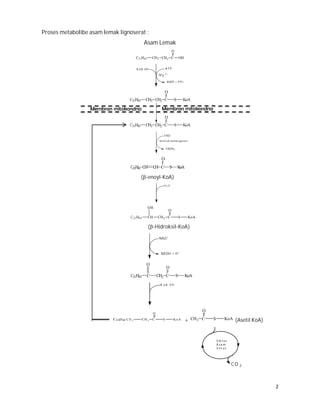 Biosintesis asam lemak lignoserat melibatkan oksidasi asam lemak dalam dua tahap yang menghasilkan asetil co-a. Proses ini mencakup pelepasan unit 2-karbon melalui serangkaian enzim, dengan total menghasilkan 181 ATP setelah aktivasi. Selain itu, asetil co-a berperan penting dalam metabolisme protein, karbohidrat, dan lemak, memasuki siklus asam sitrat untuk respirasi.